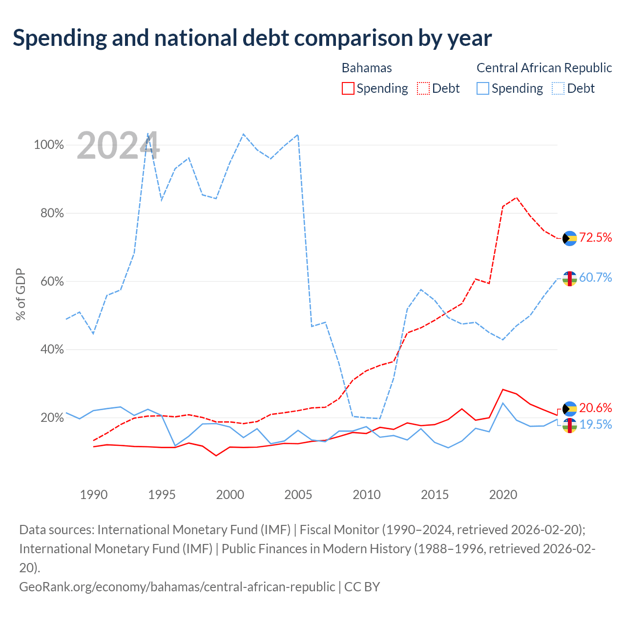 The Bahamas has $11.5B in government debt (72.5% of GDP), compared to $1.67B (60.7% of GDP) in the Central African Republic.