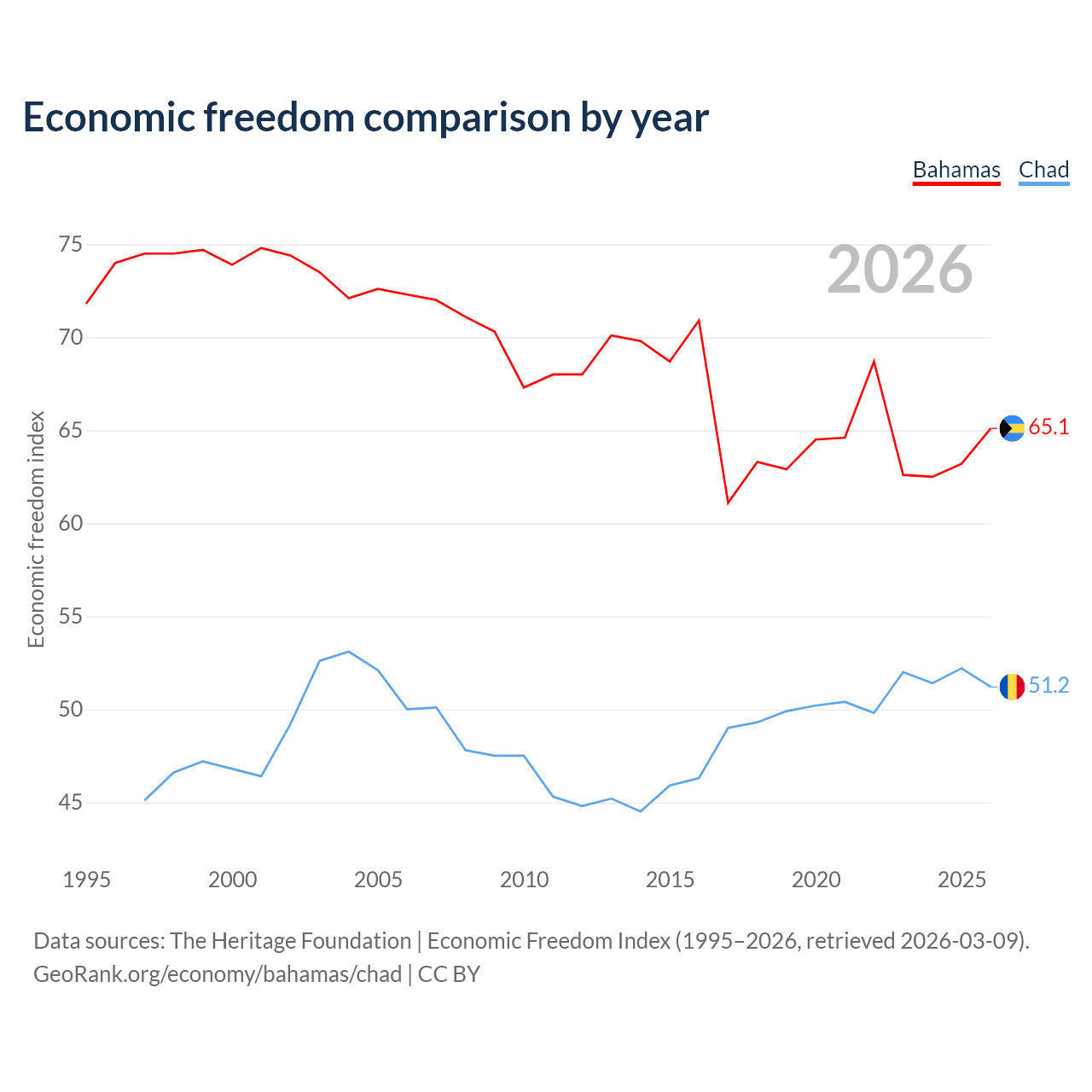 The Economic Freedom Index for the Bahamas is 65.1, ranking 66/197, compared to 51.2 for Chad, ranking 154/197. The chart above displays a comparison of annual changes in economic freedom indexes.