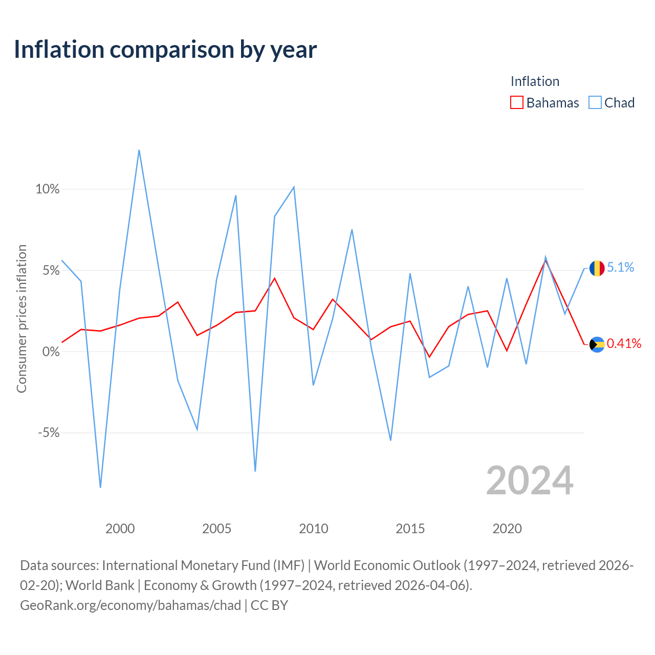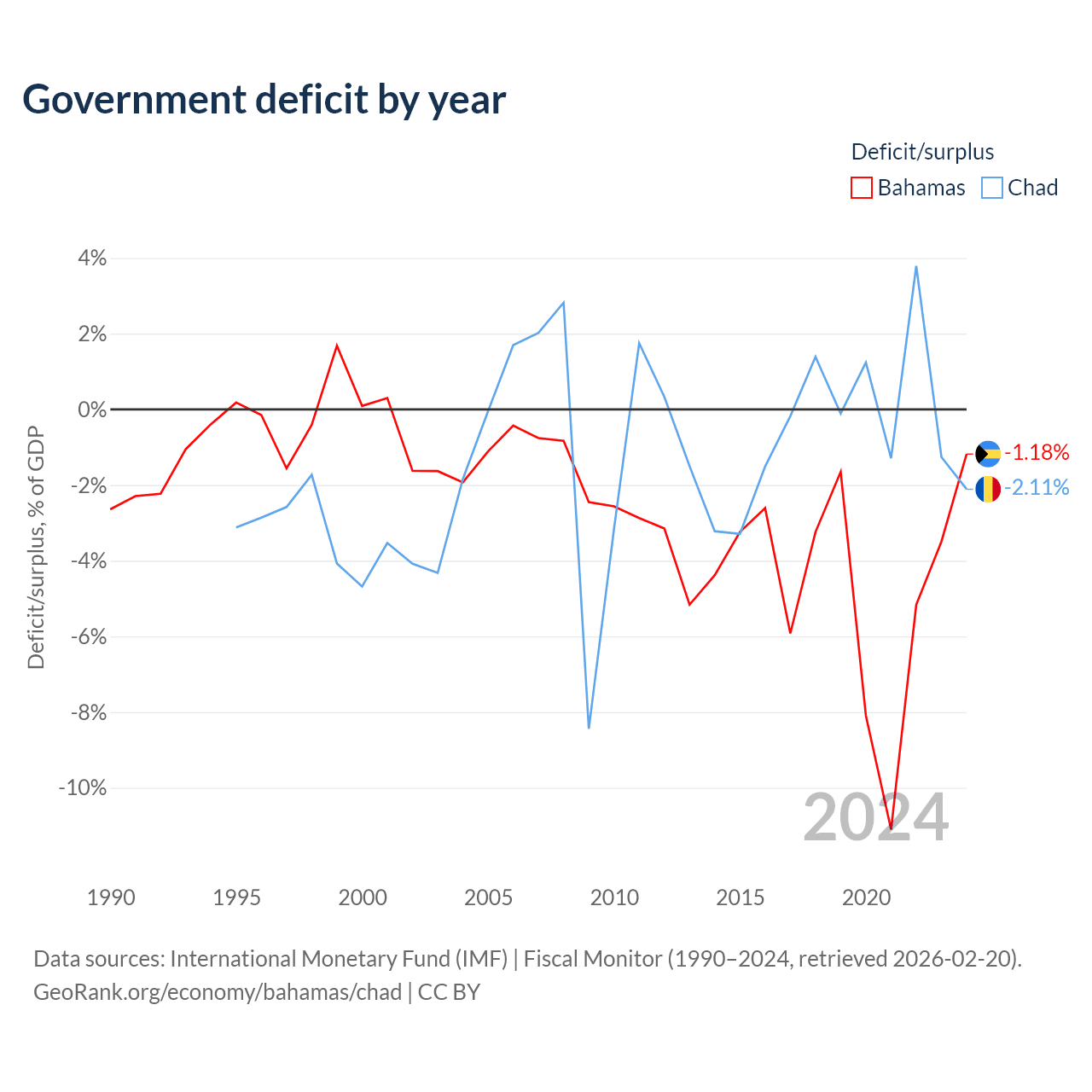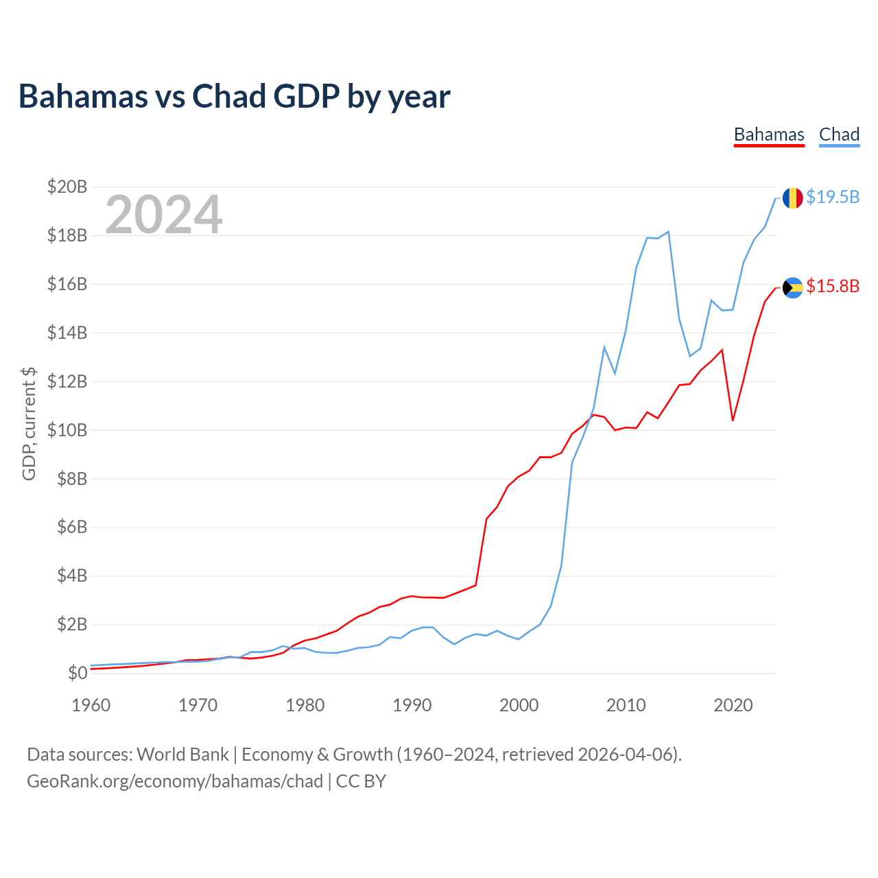 The Bahamas has a GDP of $15.8B compared to $19.5B for Chad, ranking 140/197 and 132/197 by economy size, respectively.