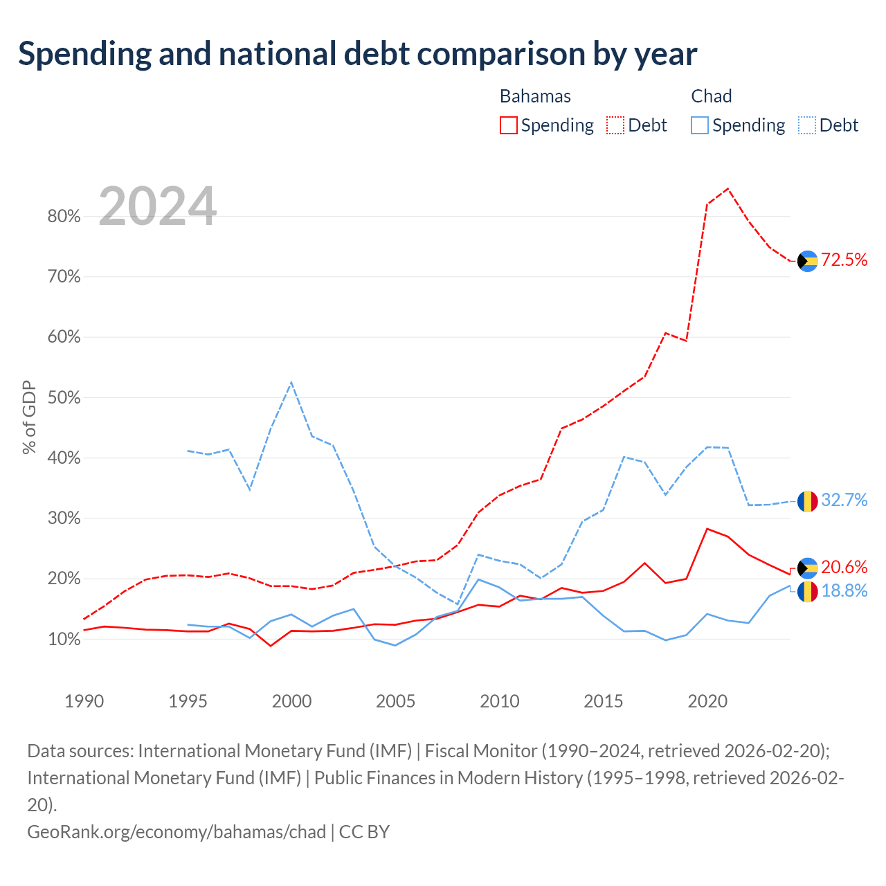 The Bahamas has $11.5B in government debt (72.5% of GDP), compared to $6.37B (32.7% of GDP) in Chad.