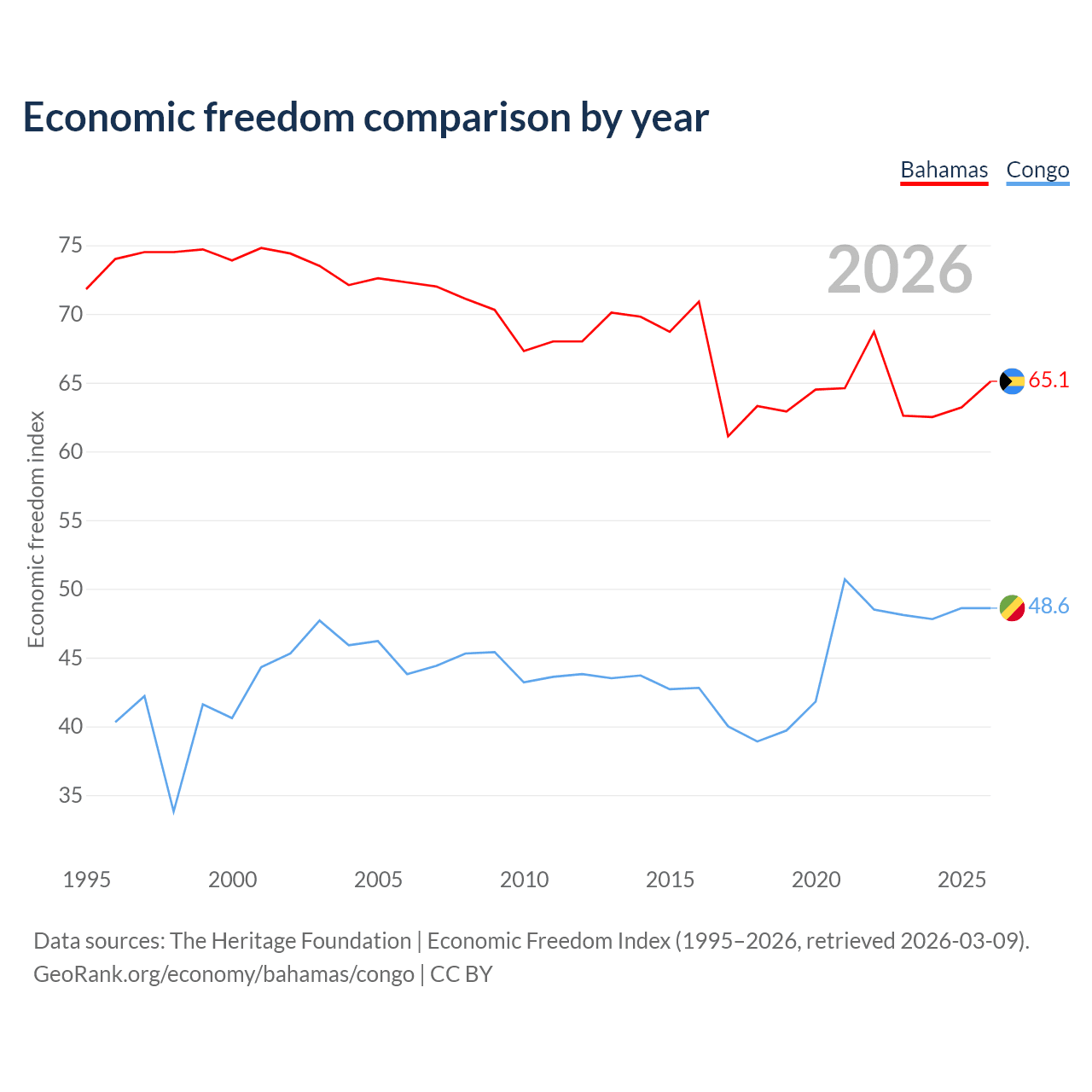 The Economic Freedom Index for the Bahamas is 65.1, ranking 66/197, compared to 48.6 for the Congo, ranking 169/197. The chart above displays a comparison of annual changes in economic freedom indexes.
