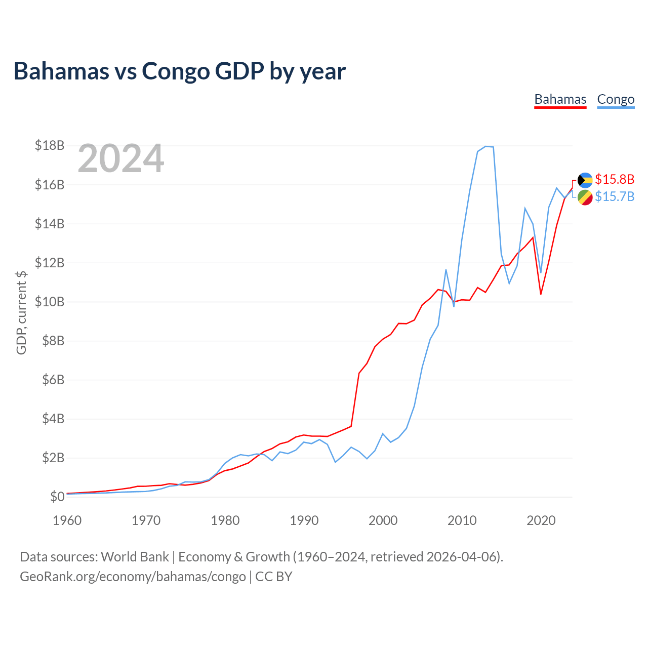 The Bahamas has a GDP of $15.8B compared to $15.7B for the Congo, ranking 140/197 and 141/197 by economy size, respectively.