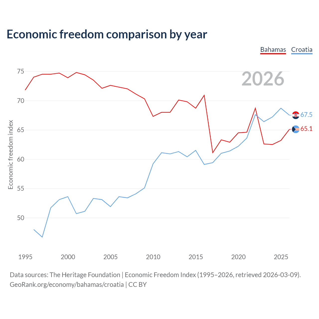 The Economic Freedom Index for the Bahamas is 65.1, ranking 66/197, compared to 67.5 for Croatia, ranking 56/197. The chart above displays a comparison of annual changes in economic freedom indexes.