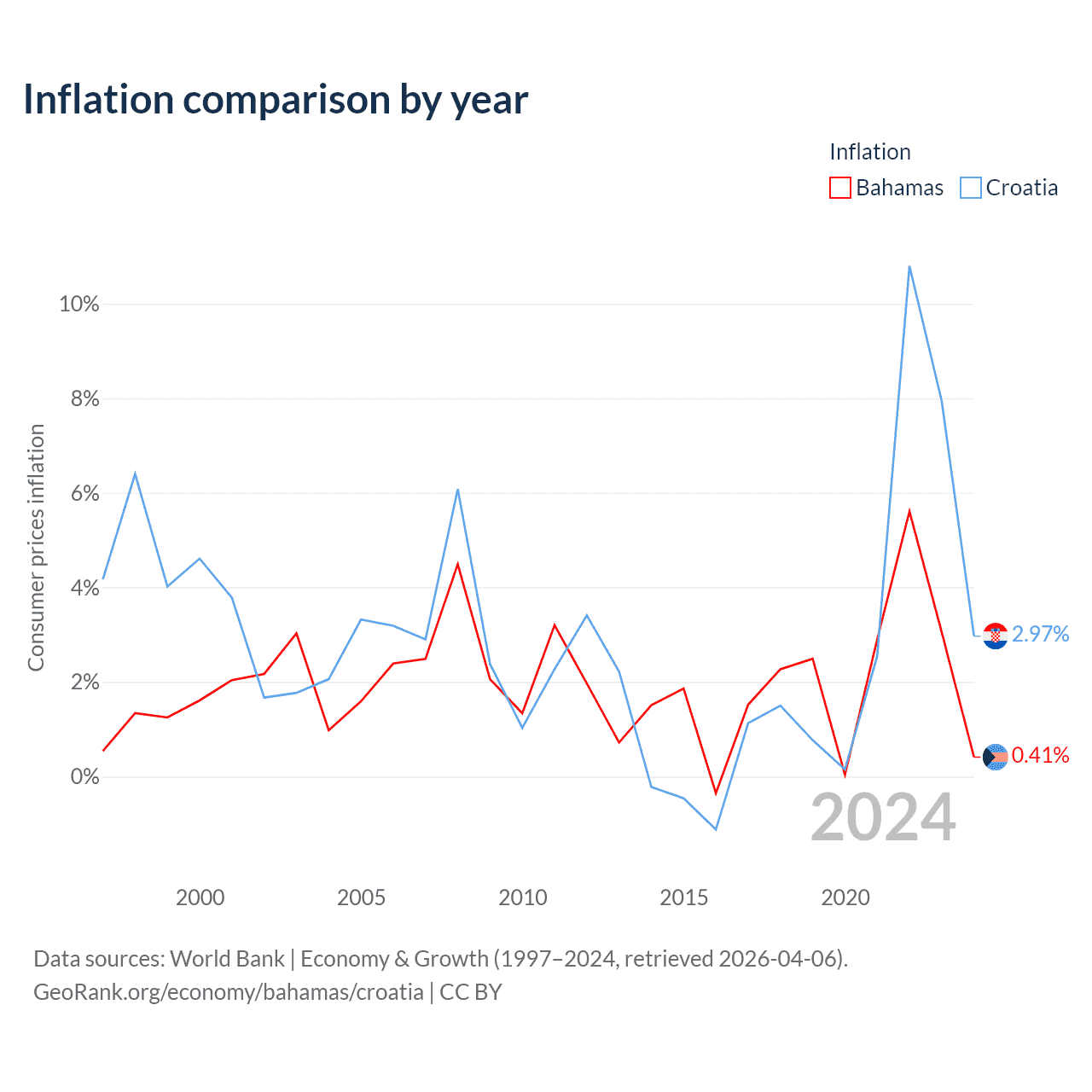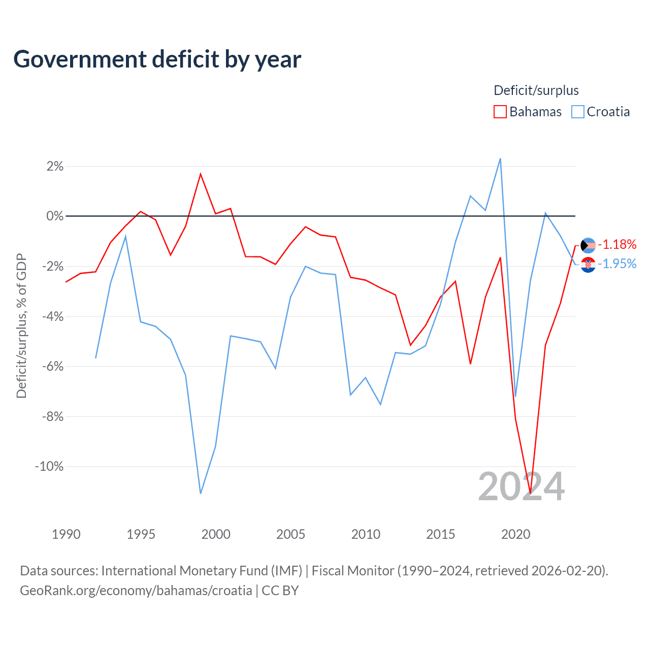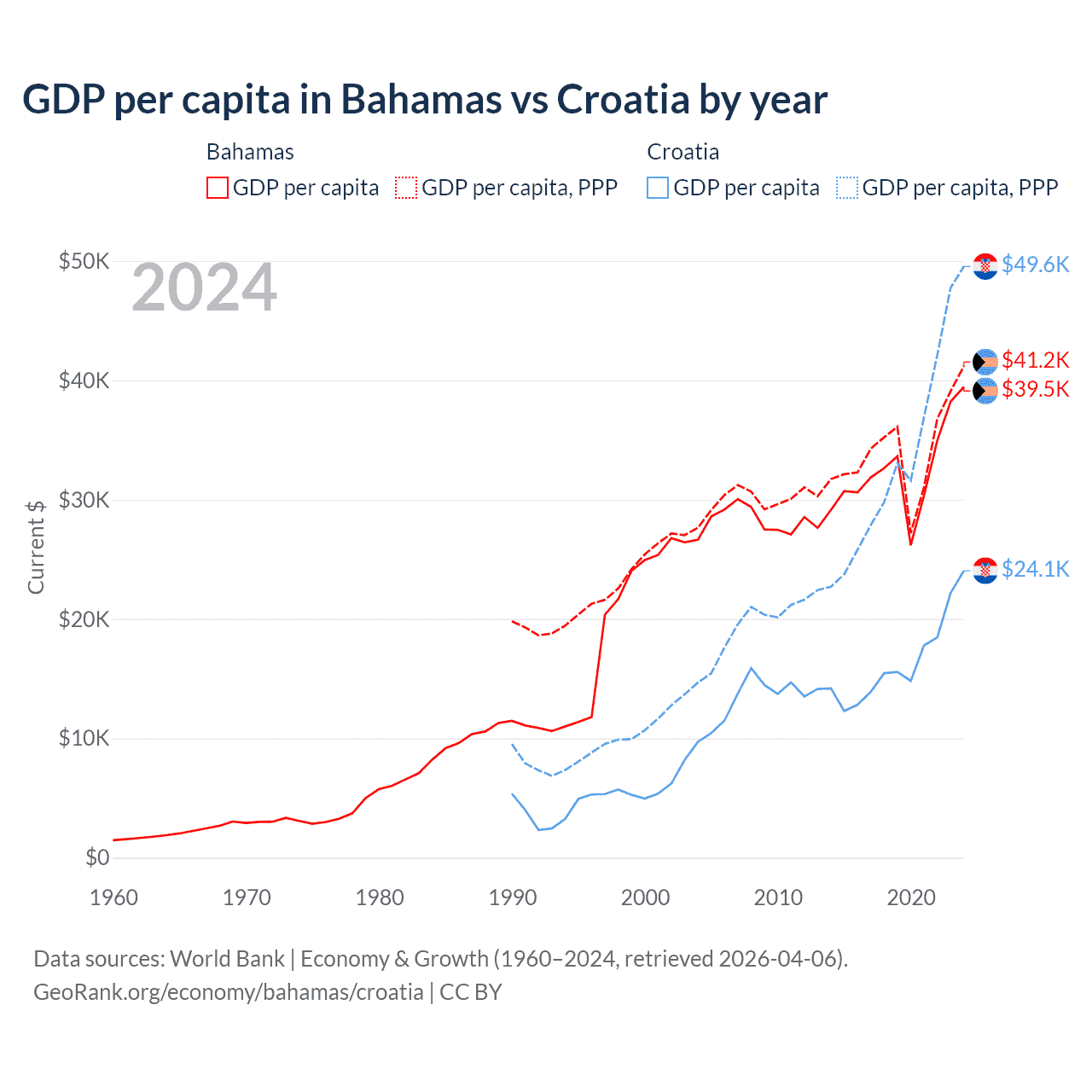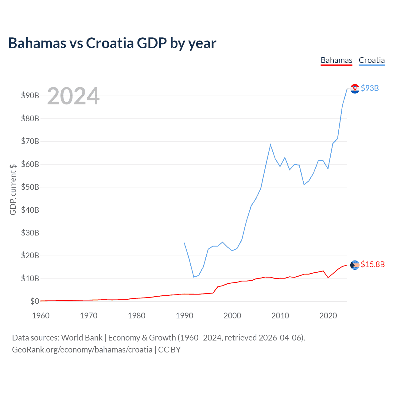 The Bahamas has a GDP of $15.8B compared to $93B for Croatia, ranking 140/197 and 75/197 by economy size, respectively.