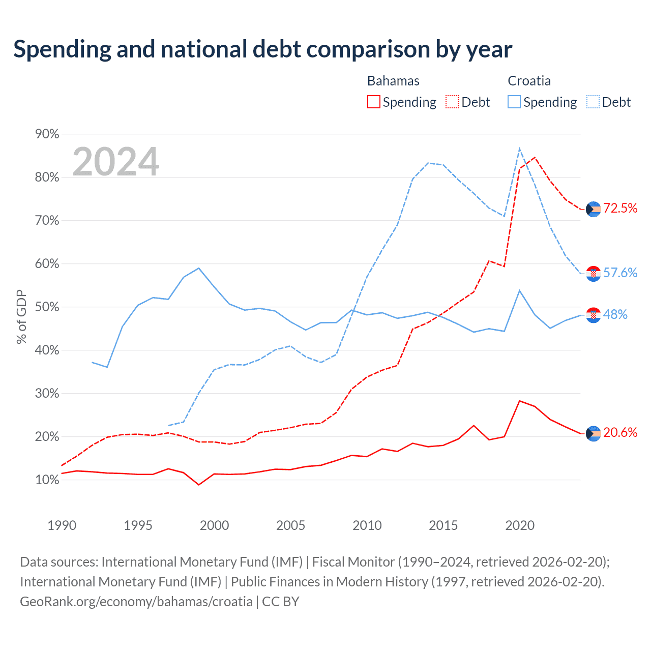 The Bahamas has $11.5B in government debt (72.5% of GDP), compared to $53.5B (57.6% of GDP) in Croatia.