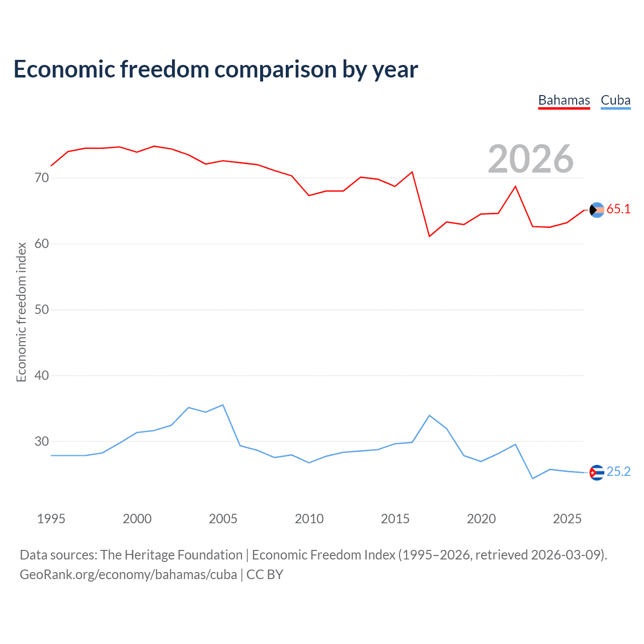 The Economic Freedom Index for the Bahamas is 65.1, ranking 66/197, compared to 25.2 for Cuba, ranking 195/197. The chart above displays a comparison of annual changes in economic freedom indexes.
