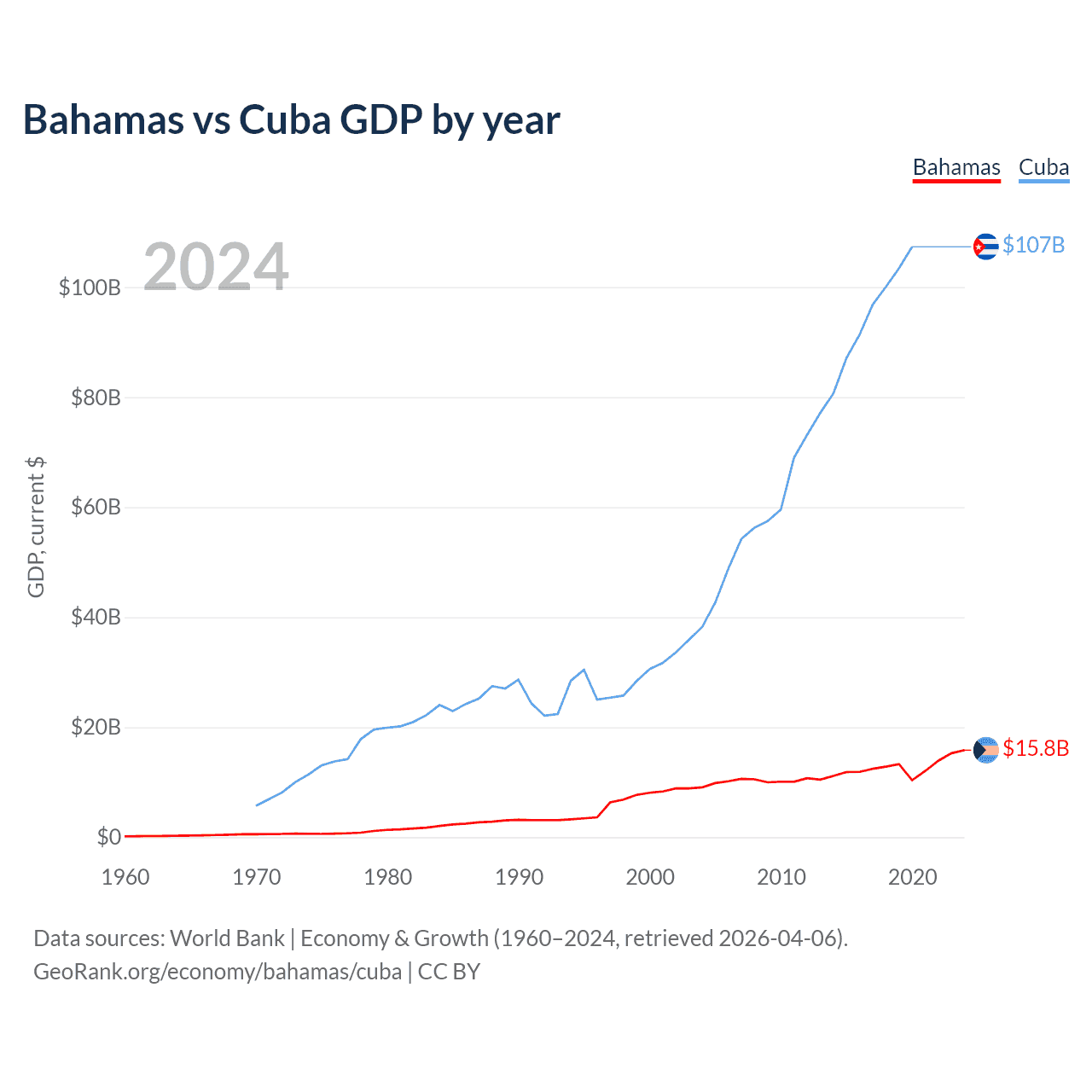 The Bahamas has a GDP of $15.8B compared to $107B for Cuba, ranking 140/197 and 69/197 by economy size, respectively.
