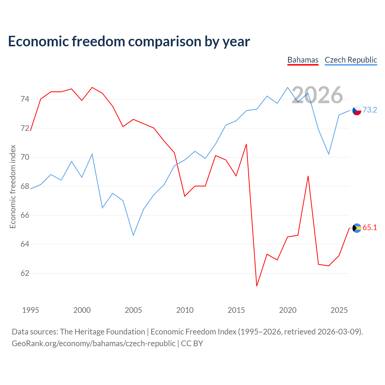 The Economic Freedom Index for the Bahamas is 65.1, ranking 66/197, compared to 73.2 for the Czech Republic, ranking 25/197. The chart above displays a comparison of annual changes in economic freedom indexes.