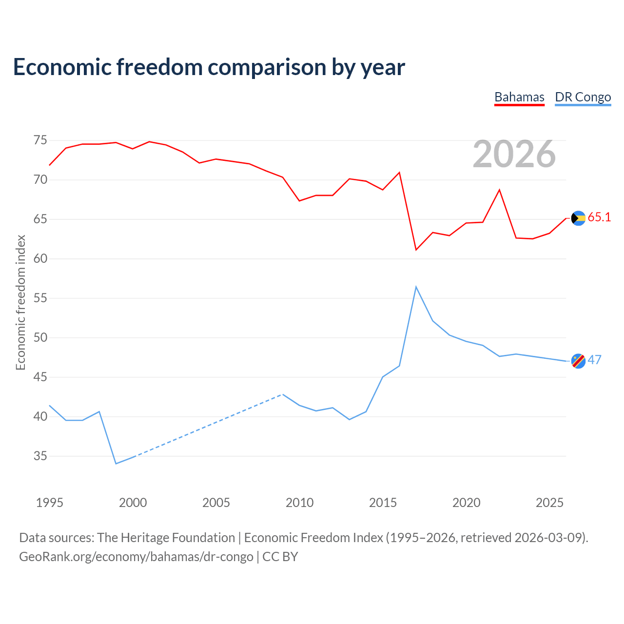 The Economic Freedom Index for the Bahamas is 65.1, ranking 66/197, compared to 47 for the DR Congo, ranking 176/197. The chart above displays a comparison of annual changes in economic freedom indexes.