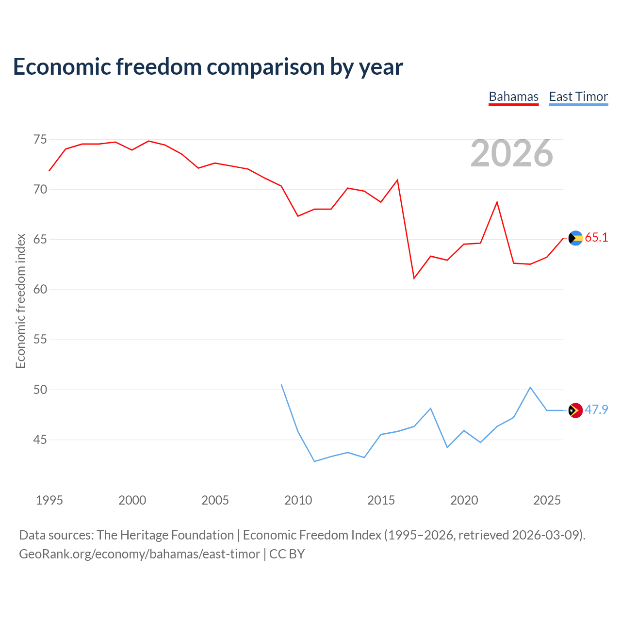 The Economic Freedom Index for the Bahamas is 65.1, ranking 66/197, compared to 47.9 for East Timor, ranking 173/197. The chart above displays a comparison of annual changes in economic freedom indexes.