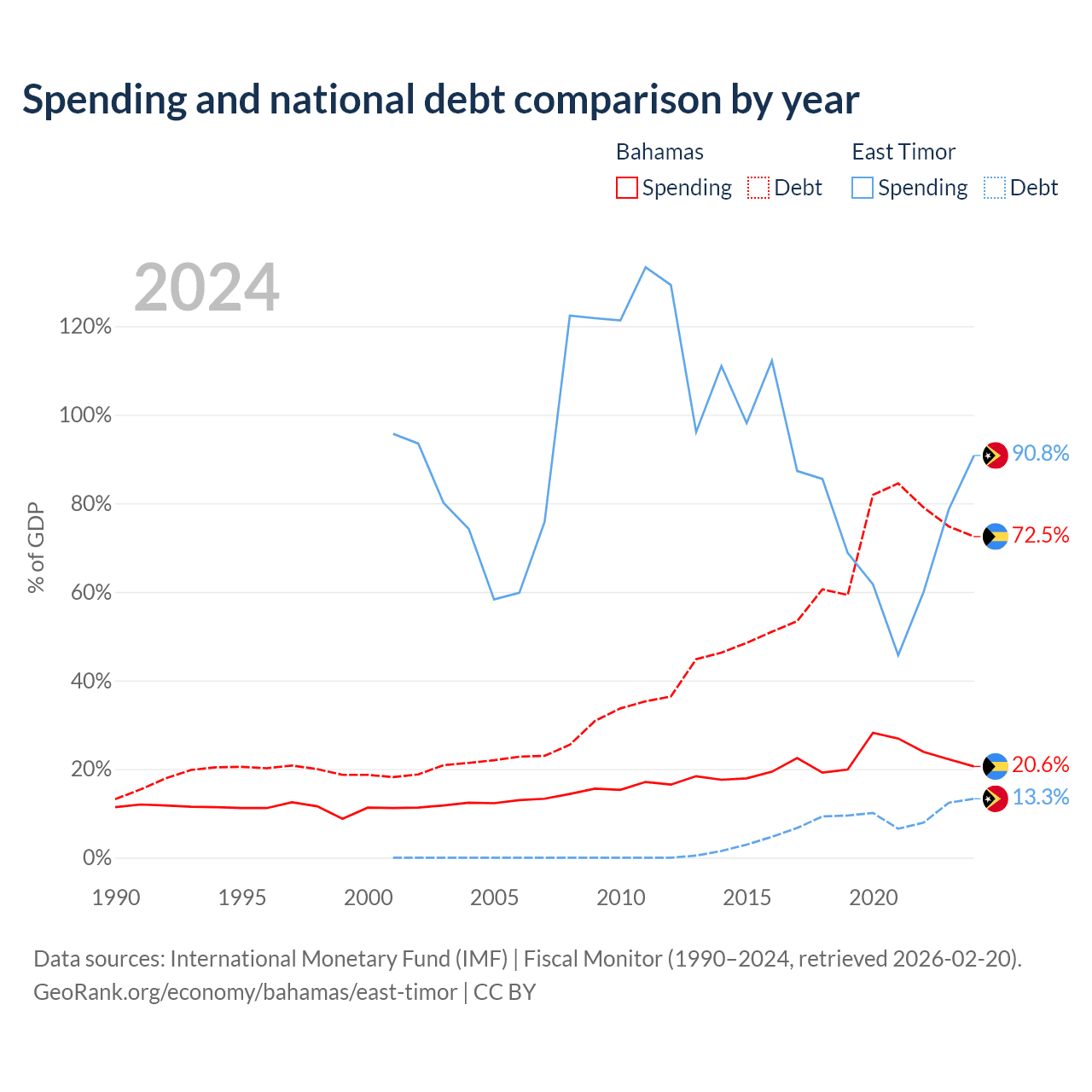 The Bahamas has $11.5B in government debt (72.5% of GDP), compared to $249M (13.3% of GDP) in East Timor.