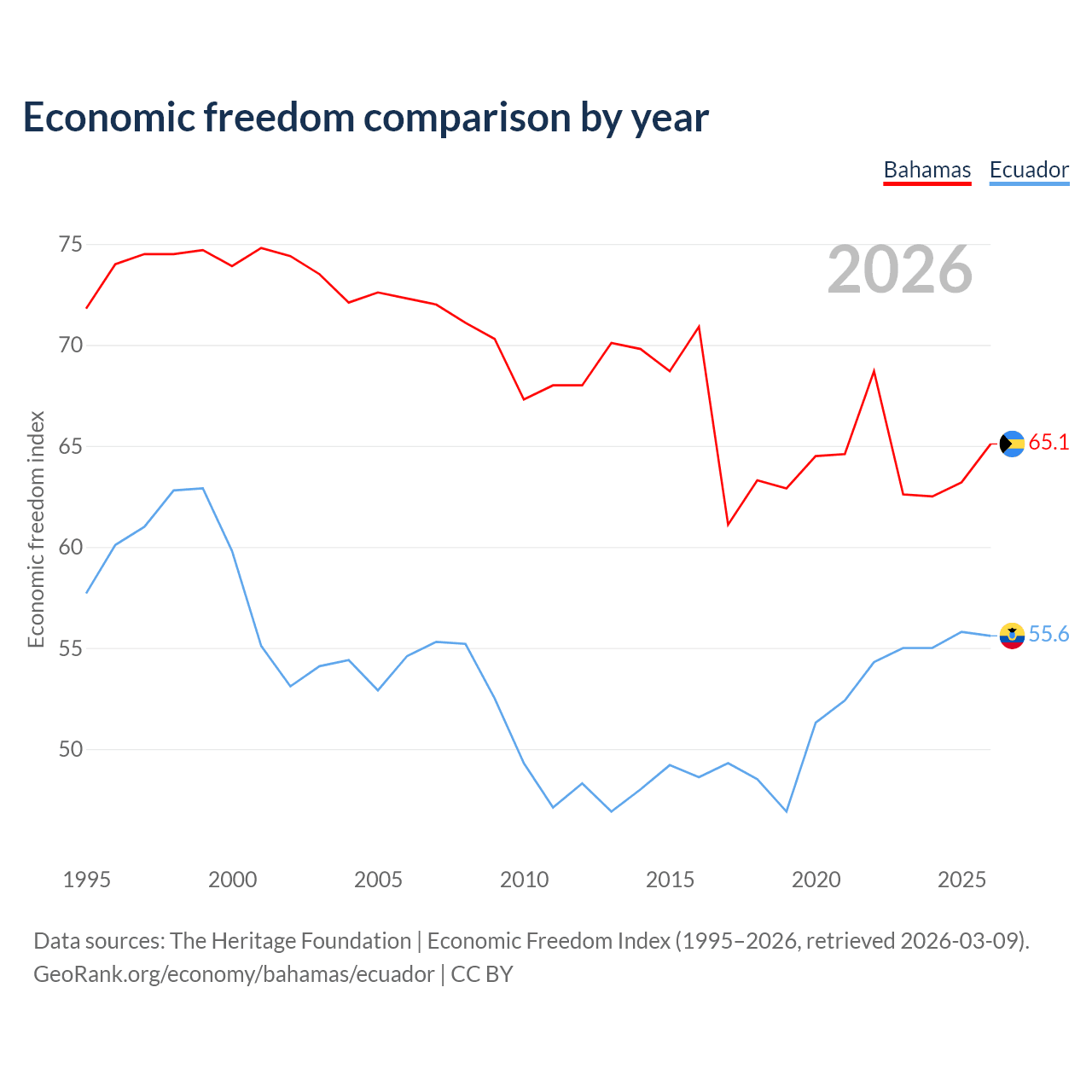 The Economic Freedom Index for the Bahamas is 65.1, ranking 66/197, compared to 55.6 for Ecuador, ranking 127/197. The chart above displays a comparison of annual changes in economic freedom indexes.