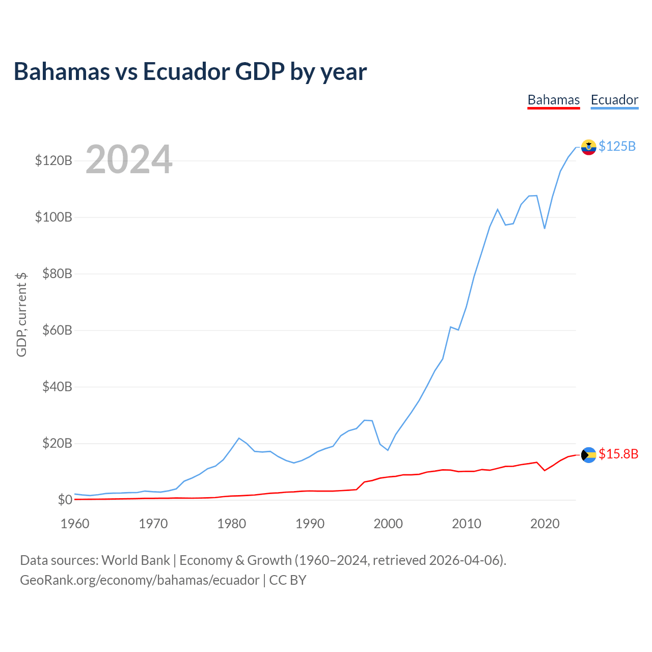 The Bahamas has a GDP of $15.8B compared to $125B for Ecuador, ranking 140/197 and 62/197 by economy size, respectively.