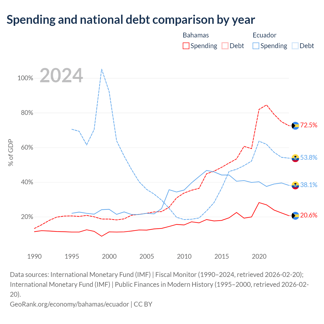 The Bahamas has $11.5B in government debt (72.5% of GDP), compared to $67B (53.8% of GDP) in Ecuador.