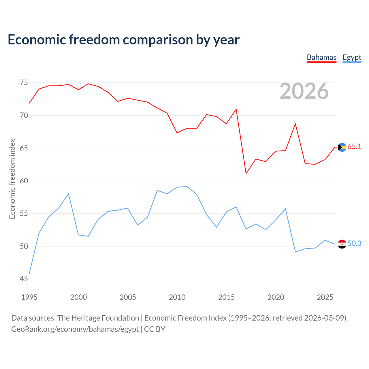 The Economic Freedom Index for the Bahamas is 65.1, ranking 66/197, compared to 50.3 for Egypt, ranking 160/197. The chart above displays a comparison of annual changes in economic freedom indexes.