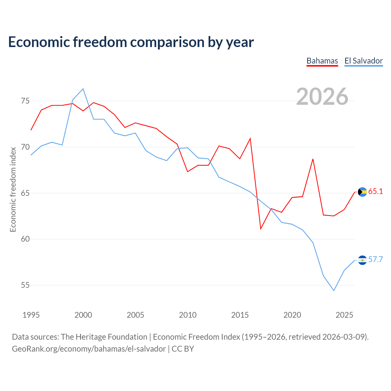 The Economic Freedom Index for the Bahamas is 65.1, ranking 66/197, compared to 57.7 for El Salvador, ranking 114/197. The chart above displays a comparison of annual changes in economic freedom indexes.