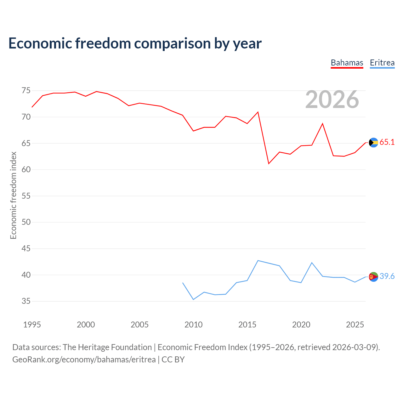 The Economic Freedom Index for the Bahamas is 65.1, ranking 66/197, compared to 39.6 for Eritrea, ranking 188/197. The chart above displays a comparison of annual changes in economic freedom indexes.