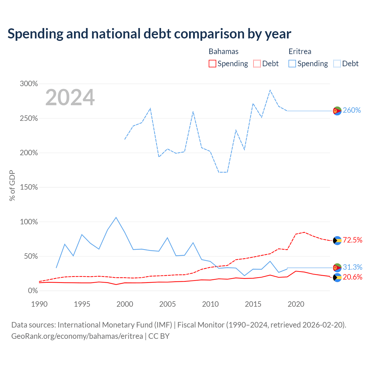 The Bahamas has $11.5B in government debt (72.5% of GDP), compared to $3.54B (260.4% of GDP) in Eritrea.