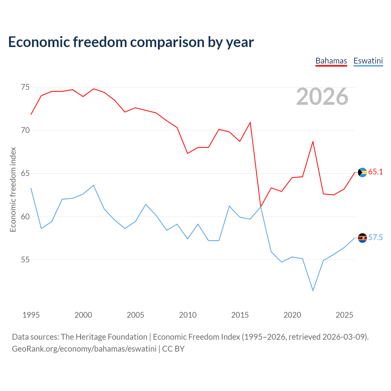 The Economic Freedom Index for the Bahamas is 65.1, ranking 66/197, compared to 57.5 for Eswatini, ranking 116/197. The chart above displays a comparison of annual changes in economic freedom indexes.