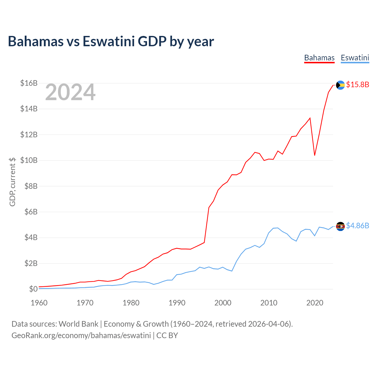 The Bahamas has a GDP of $15.8B compared to $4.86B for Eswatini, ranking 140/197 and 162/197 by economy size, respectively.