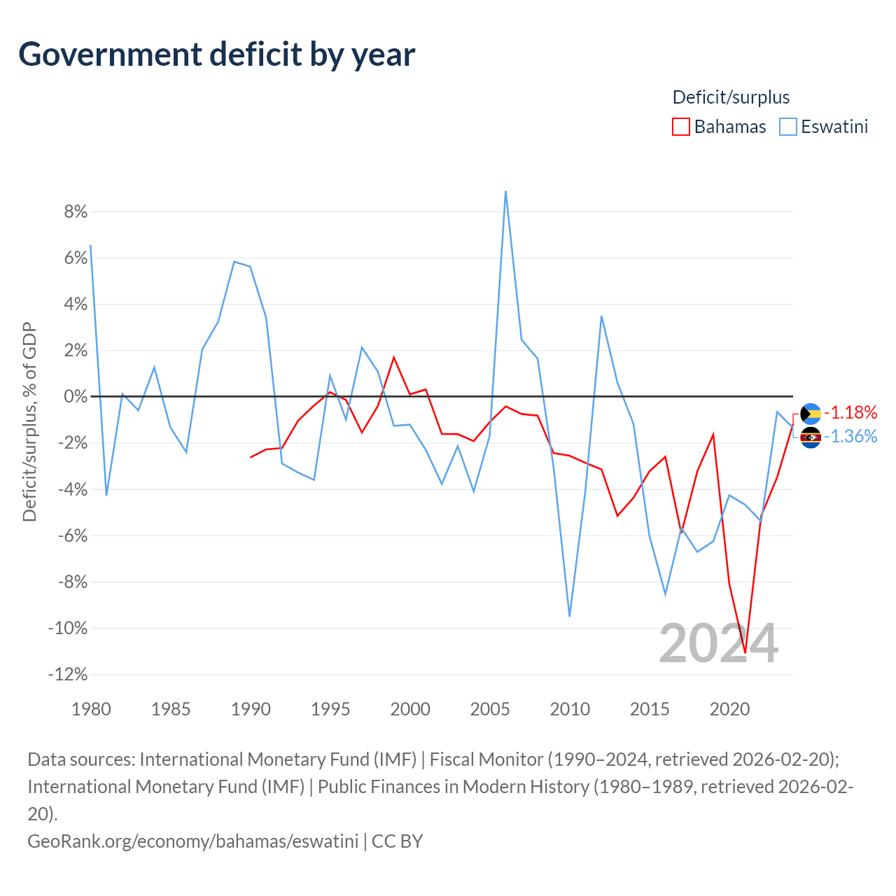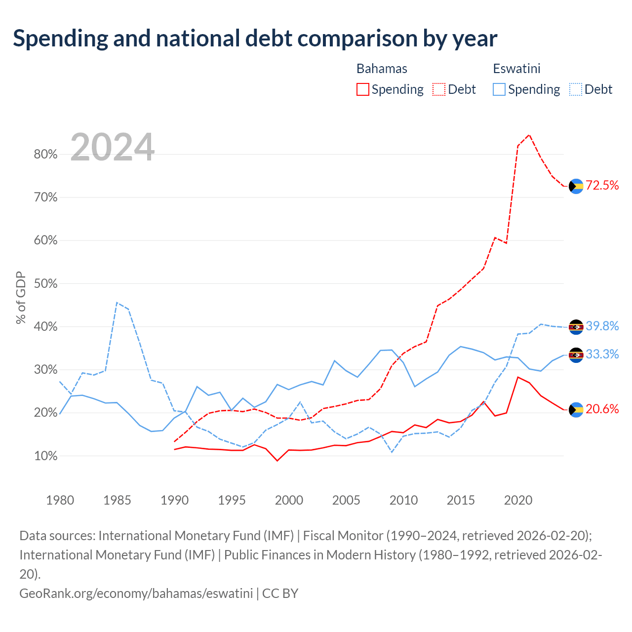The Bahamas has $11.5B in government debt (72.5% of GDP), compared to $1.93B (39.8% of GDP) in Eswatini.
