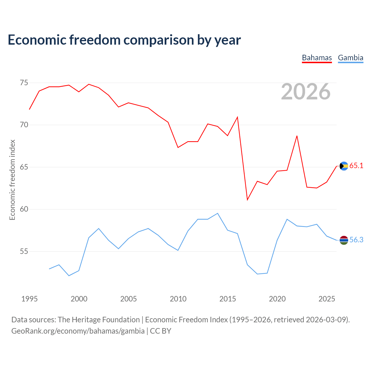 The Economic Freedom Index for the Bahamas is 65.1, ranking 66/197, compared to 56.3 for the Gambia, ranking 123/197. The chart above displays a comparison of annual changes in economic freedom indexes.