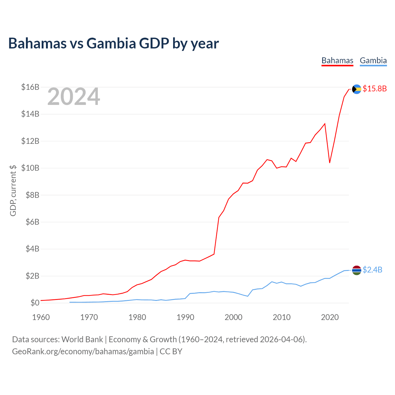 The Bahamas has a GDP of $15.8B compared to $2.4B for the Gambia, ranking 140/197 and 174/197 by economy size, respectively.