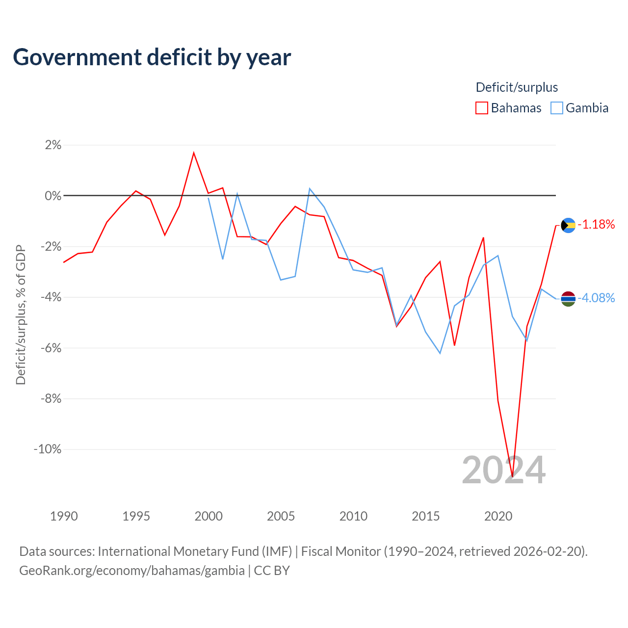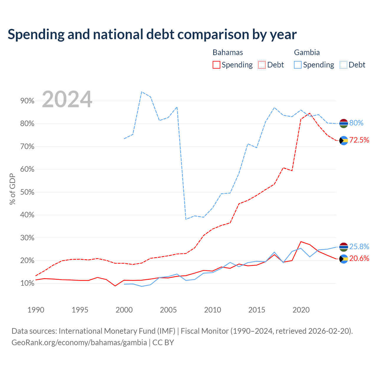 The Bahamas has $11.5B in government debt (72.5% of GDP), compared to $1.92B (80% of GDP) in the Gambia.