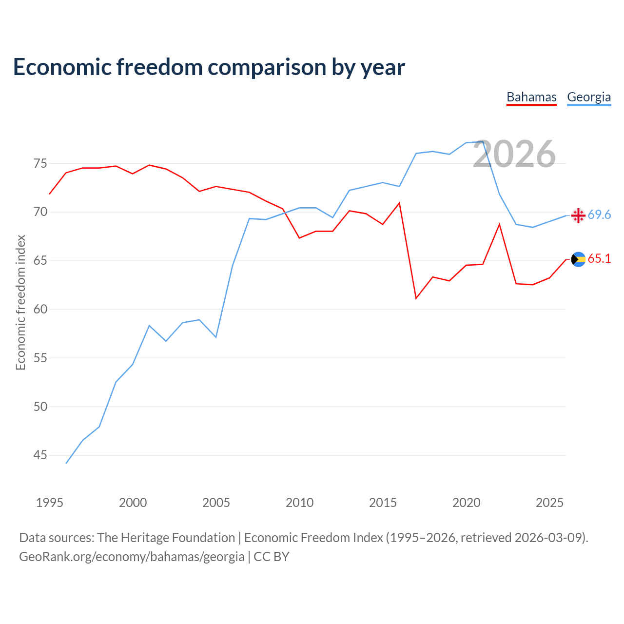 The Economic Freedom Index for the Bahamas is 65.1, ranking 66/197, compared to 69.6 for Georgia, ranking 41/197. The chart above displays a comparison of annual changes in economic freedom indexes.