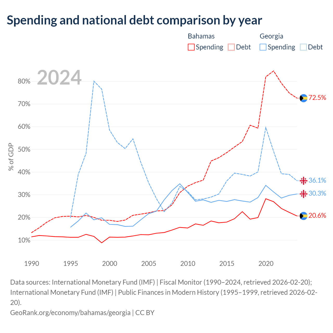 The Bahamas has $11.5B in government debt (72.5% of GDP), compared to $12.3B (36.1% of GDP) in Georgia.