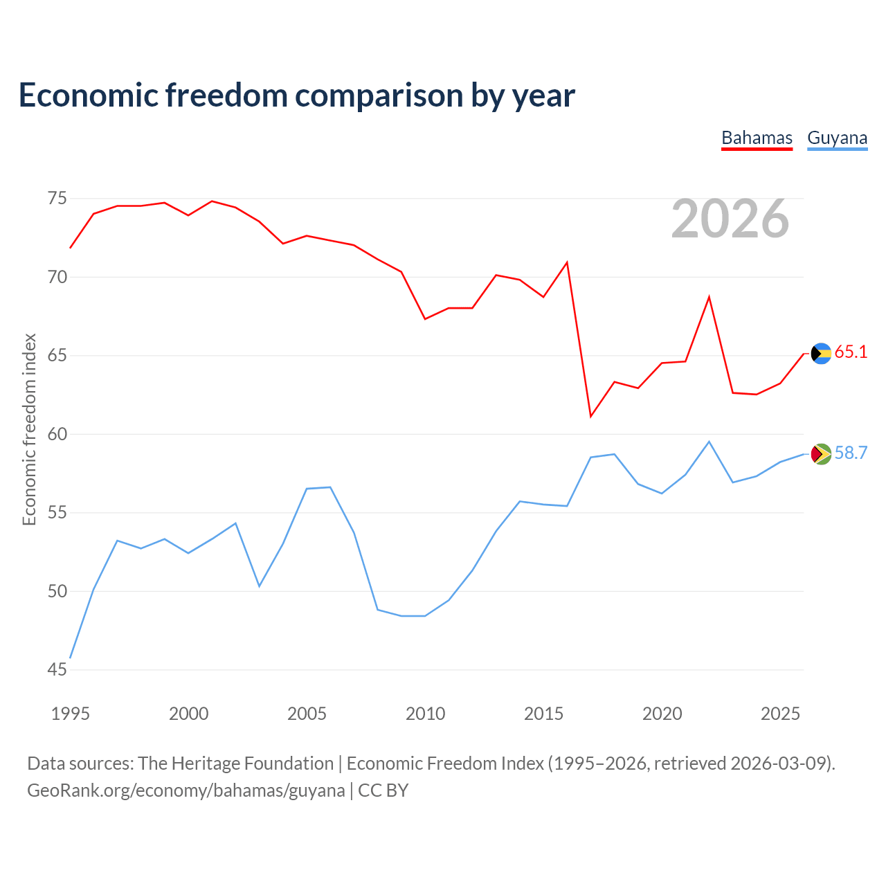 The Economic Freedom Index for the Bahamas is 65.1, ranking 66/197, compared to 58.7 for Guyana, ranking 109/197. The chart above displays a comparison of annual changes in economic freedom indexes.