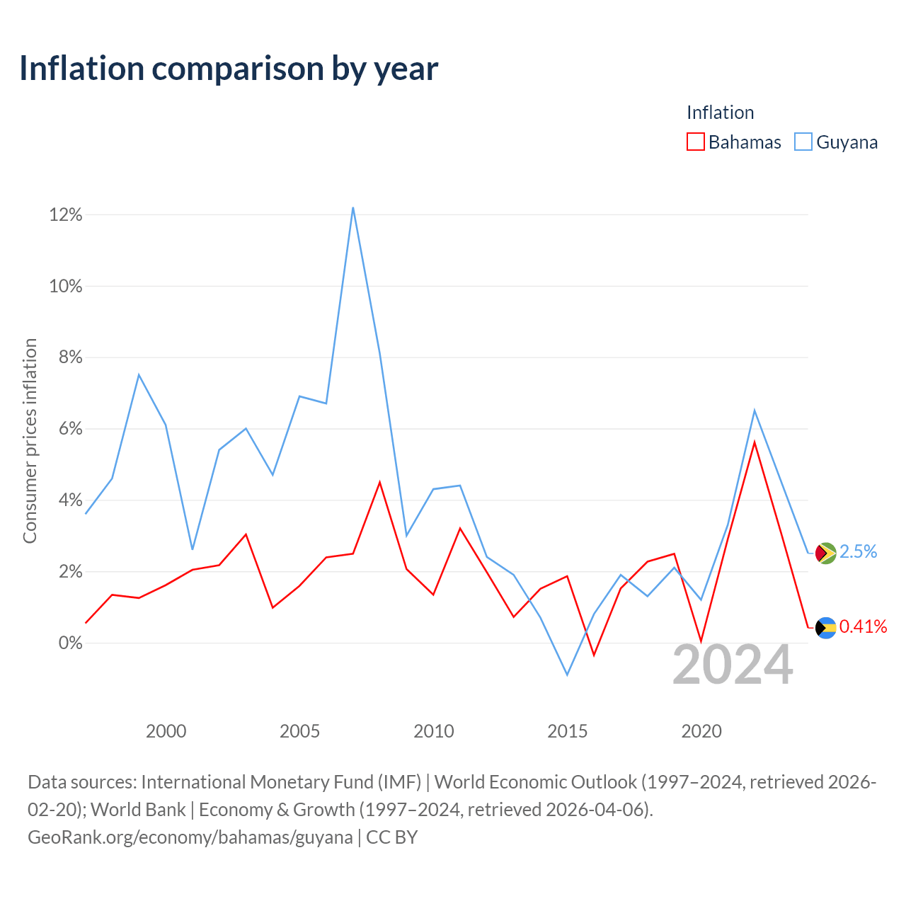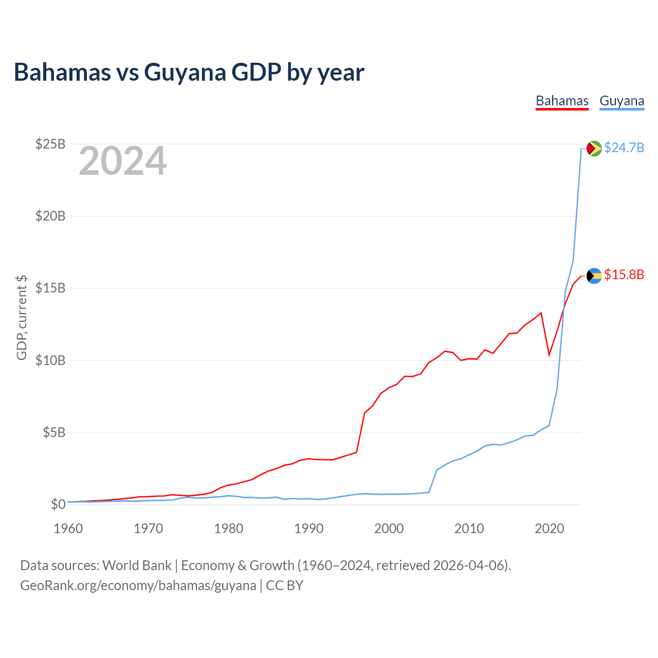 The Bahamas has a GDP of $15.8B compared to $24.7B for Guyana, ranking 140/197 and 120/197 by economy size, respectively.