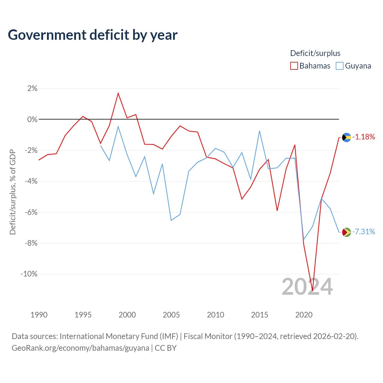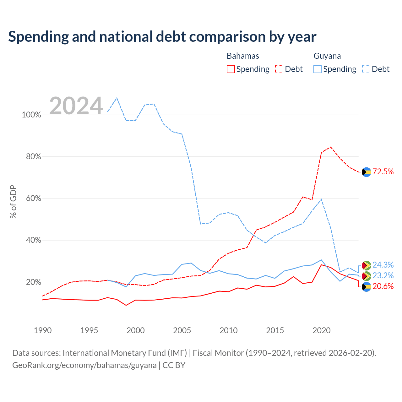 The Bahamas has $11.5B in government debt (72.5% of GDP), compared to $5.99B (24.3% of GDP) in Guyana.