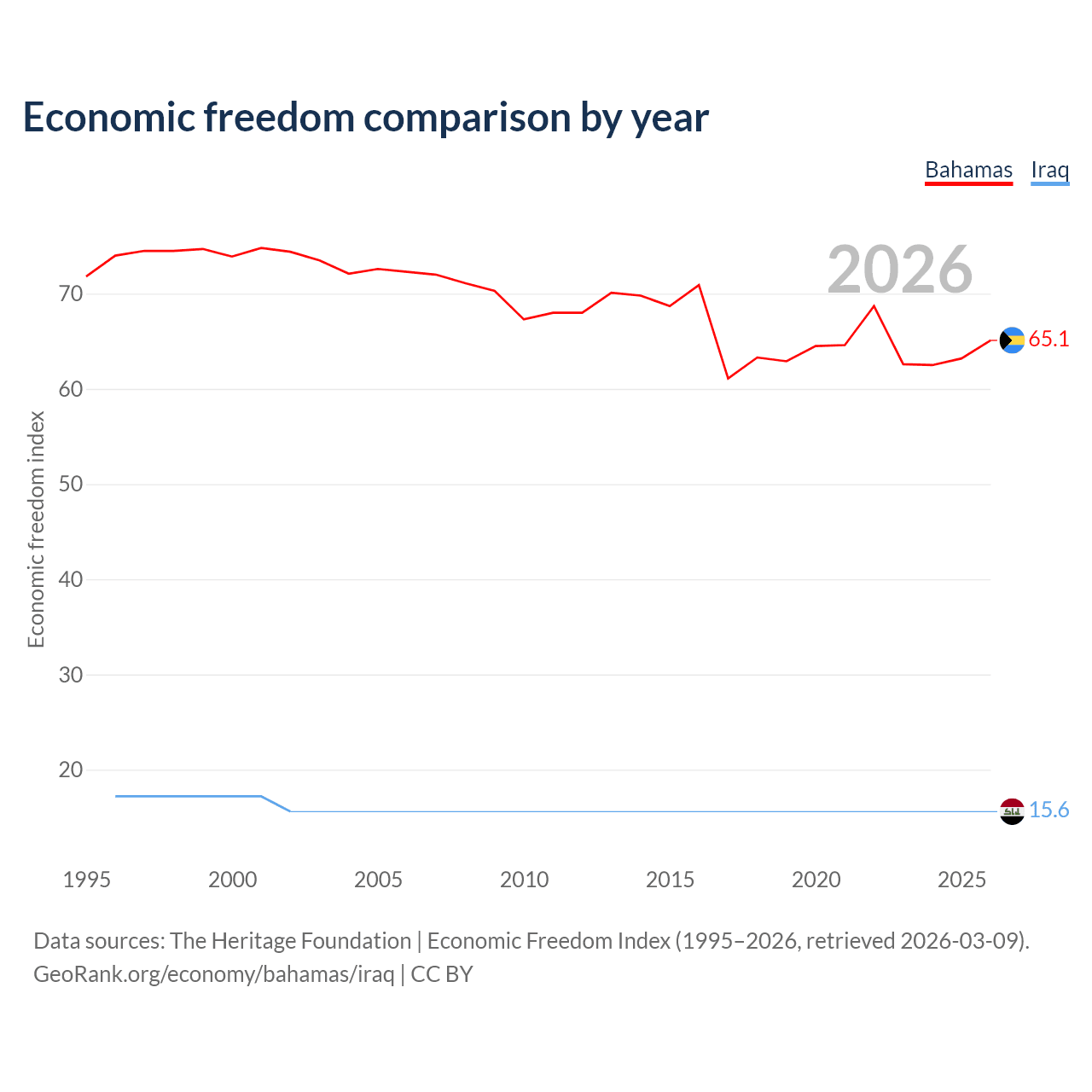 The Economic Freedom Index for the Bahamas is 65.1, ranking 66/197, compared to 15.6 for Iraq, ranking 196/197. The chart above displays a comparison of annual changes in economic freedom indexes.