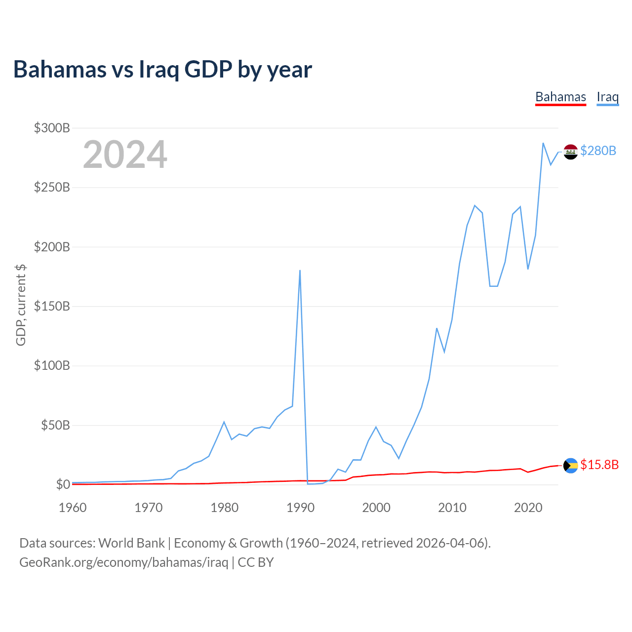 The Bahamas has a GDP of $15.8B compared to $280B for Iraq, ranking 140/197 and 50/197 by economy size, respectively.
