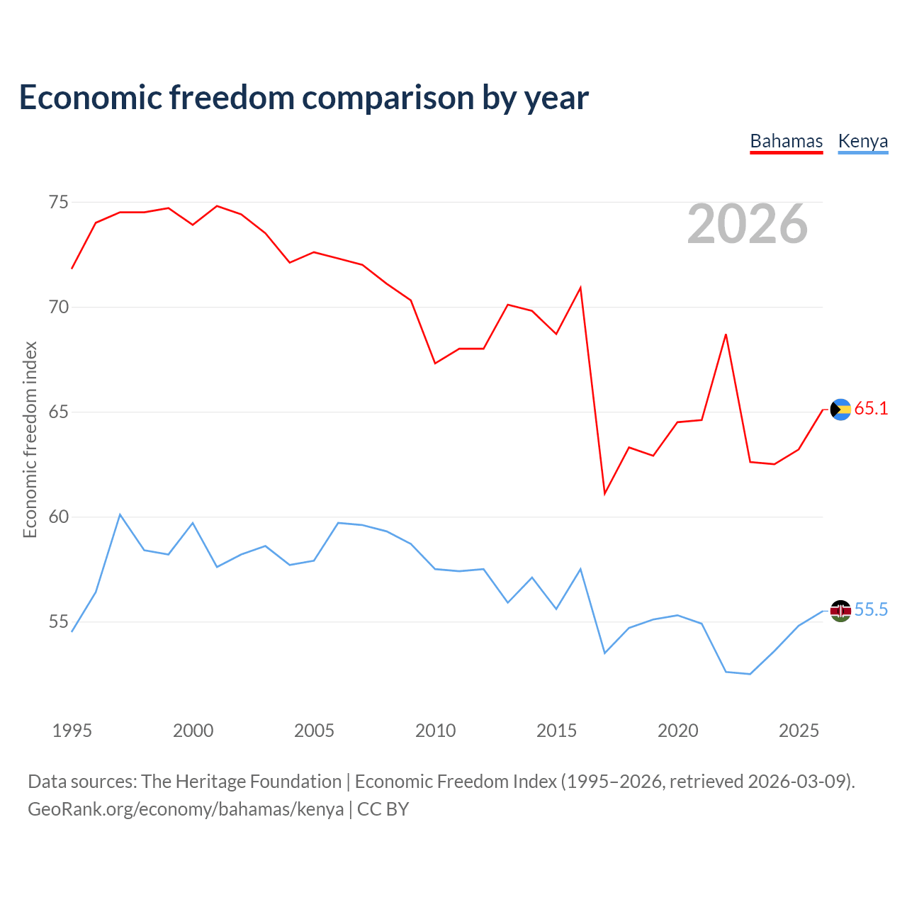 The Economic Freedom Index for the Bahamas is 65.1, ranking 66/197, compared to 55.5 for Kenya, ranking 128/197. The chart above displays a comparison of annual changes in economic freedom indexes.