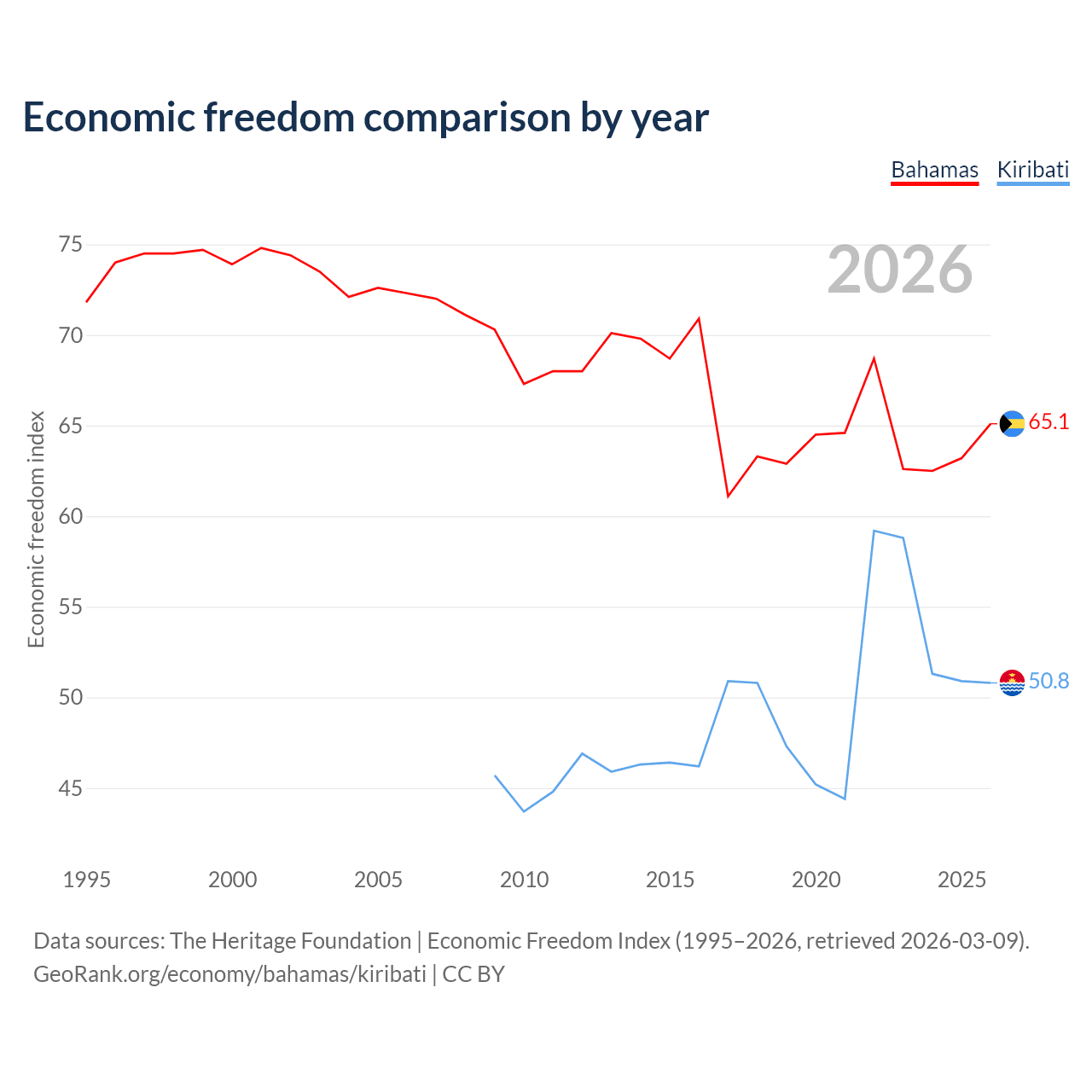 The Economic Freedom Index for the Bahamas is 65.1, ranking 66/197, compared to 50.8 for Kiribati, ranking 158/197. The chart above displays a comparison of annual changes in economic freedom indexes.