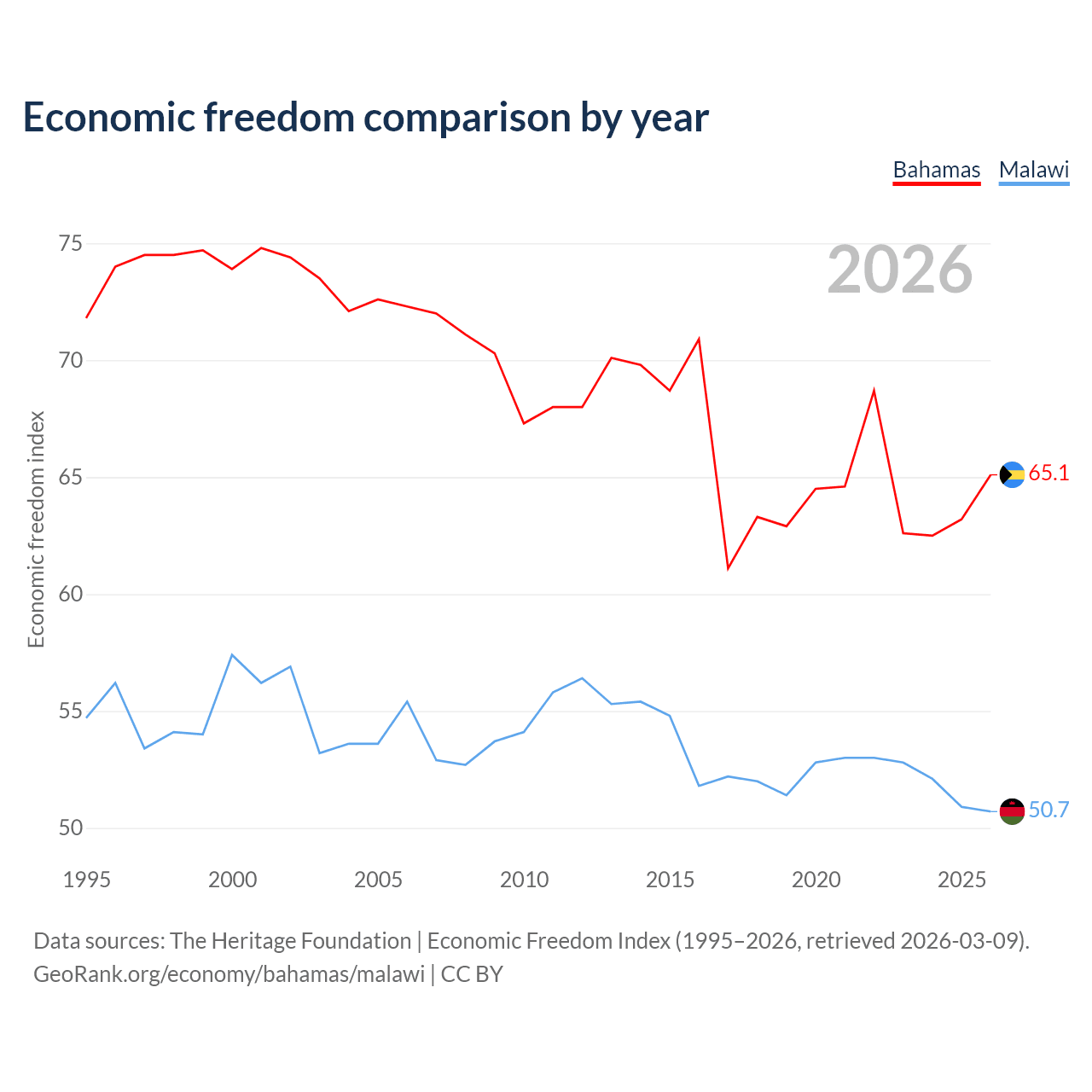 The Economic Freedom Index for the Bahamas is 65.1, ranking 66/197, compared to 50.7 for Malawi, ranking 159/197. The chart above displays a comparison of annual changes in economic freedom indexes.