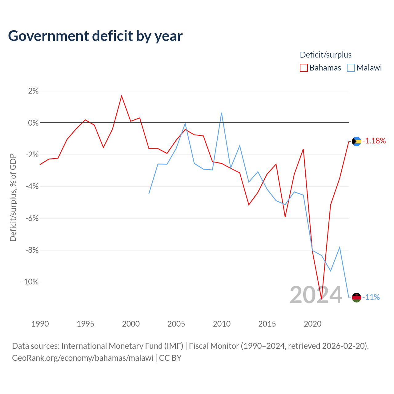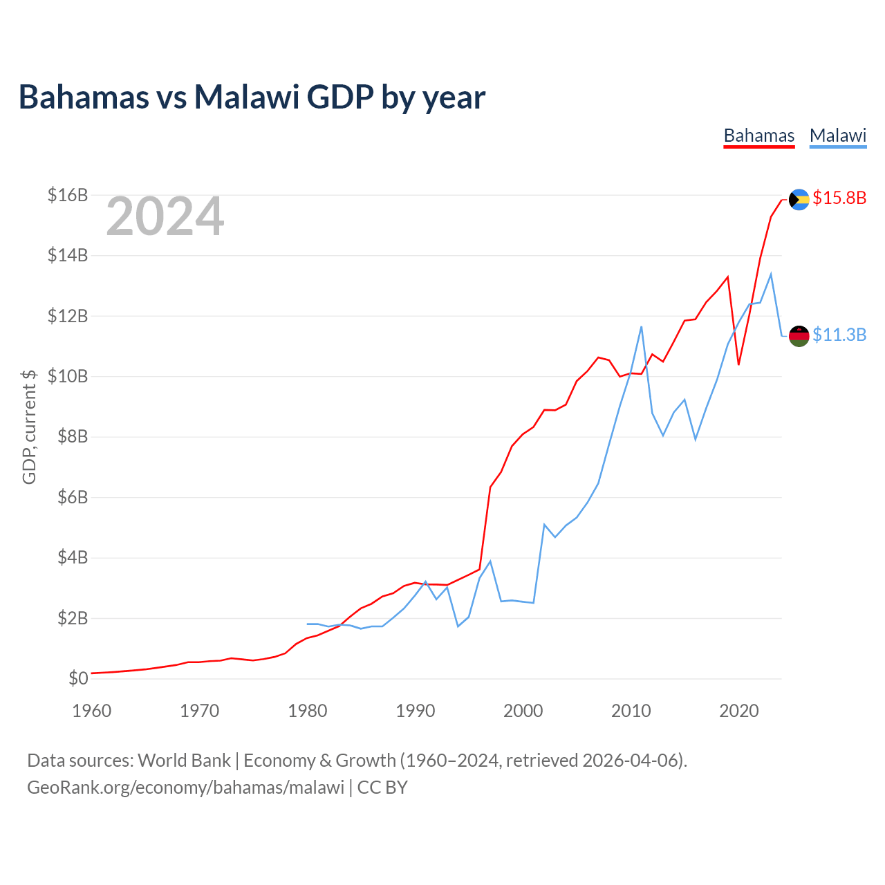 The Bahamas has a GDP of $15.8B compared to $11.3B for Malawi, ranking 140/197 and 151/197 by economy size, respectively.