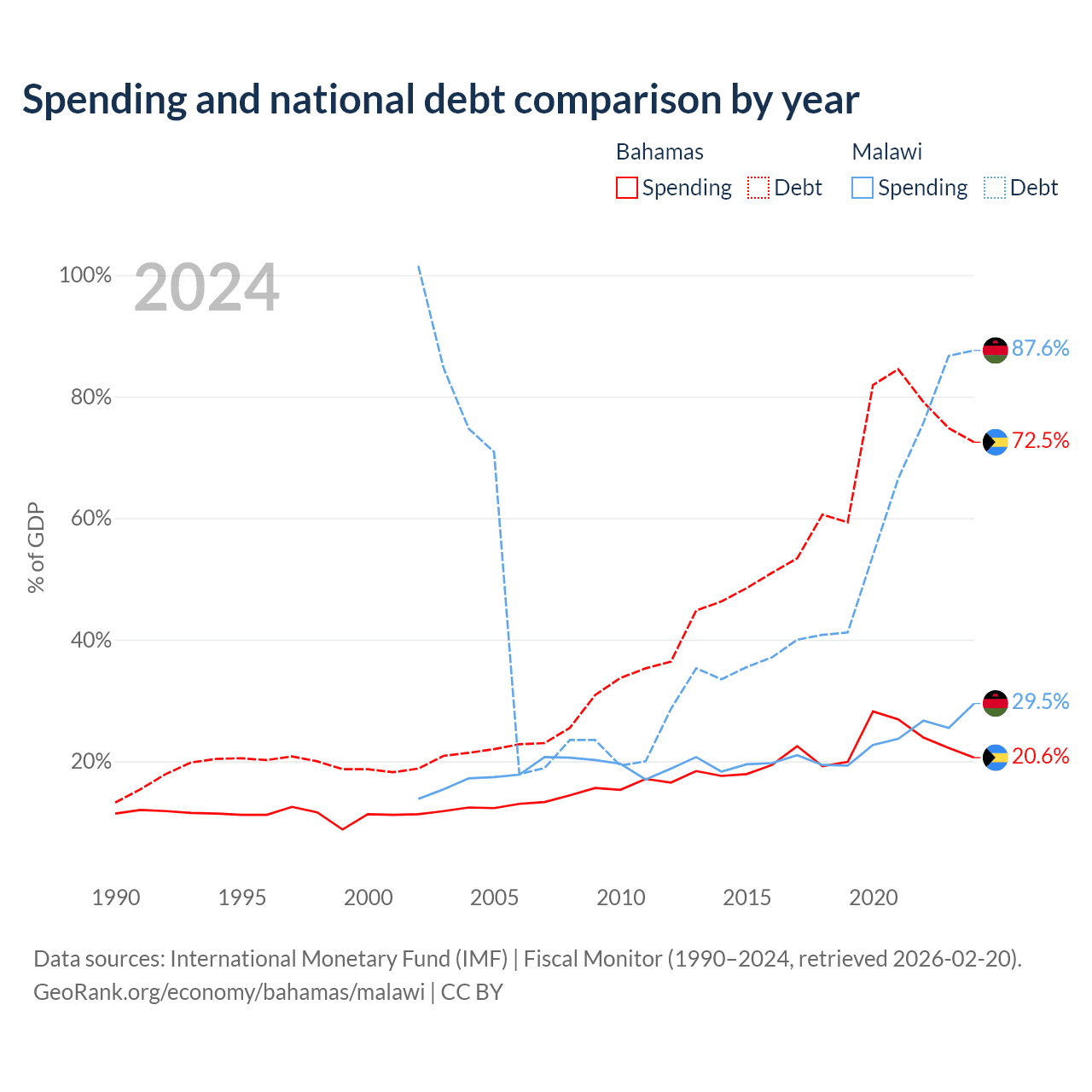 The Bahamas has $11.5B in government debt (72.5% of GDP), compared to $9.91B (87.6% of GDP) in Malawi.