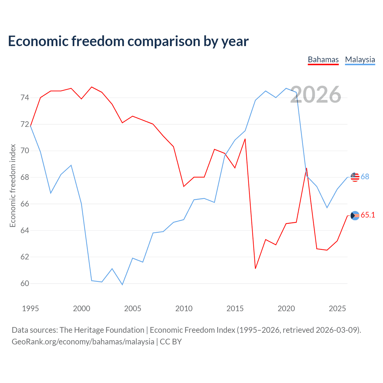 The Economic Freedom Index for the Bahamas is 65.1, ranking 66/197, compared to 68 for Malaysia, ranking 51/197. The chart above displays a comparison of annual changes in economic freedom indexes.