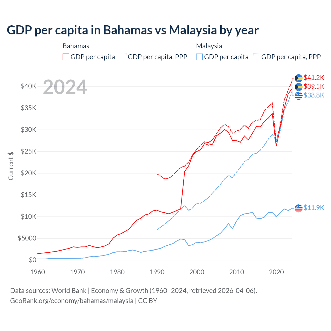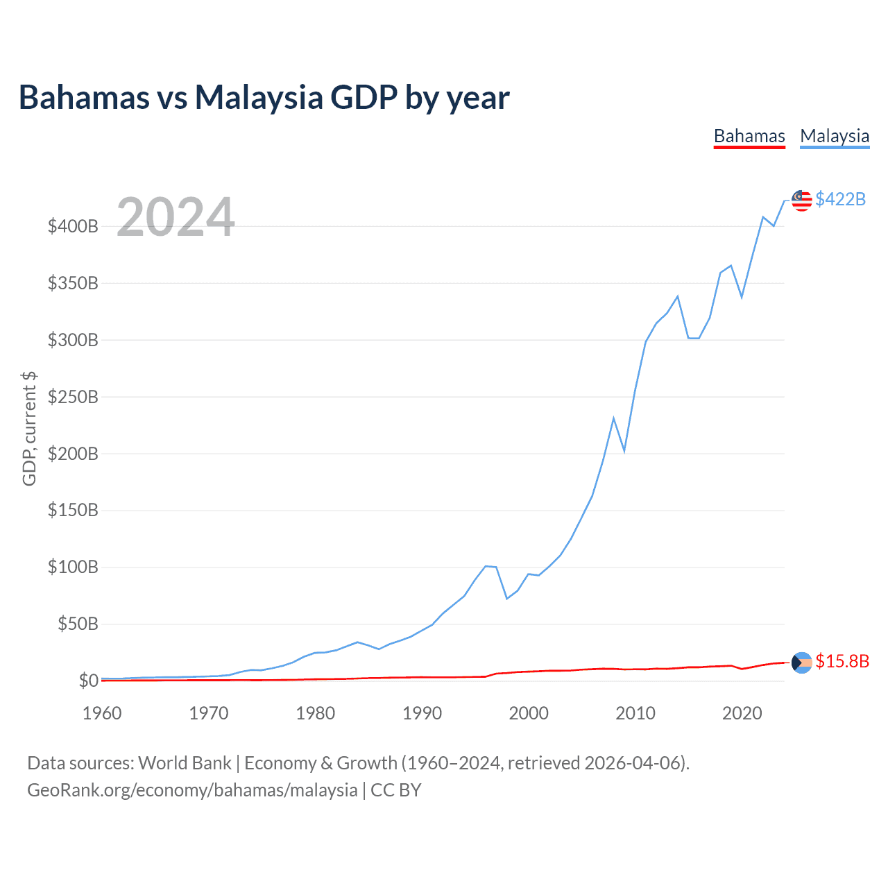 The Bahamas has a GDP of $15.8B compared to $422B for Malaysia, ranking 140/197 and 38/197 by economy size, respectively.
