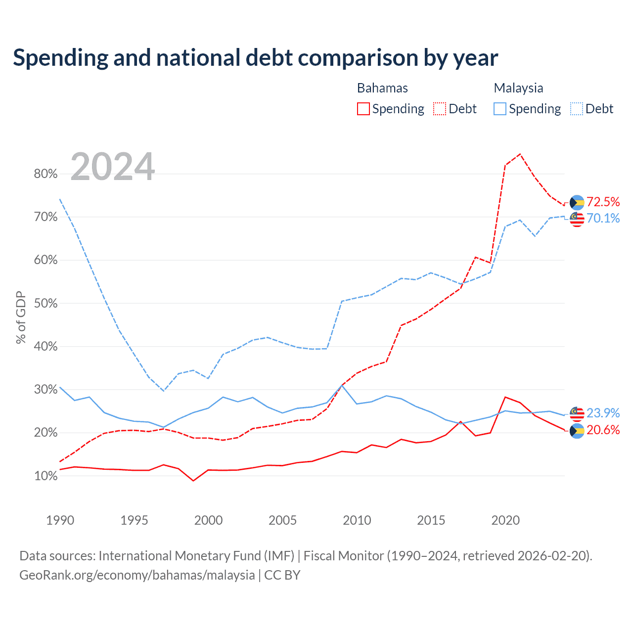 The Bahamas has $11.5B in government debt (72.5% of GDP), compared to $296B (70.1% of GDP) in Malaysia.