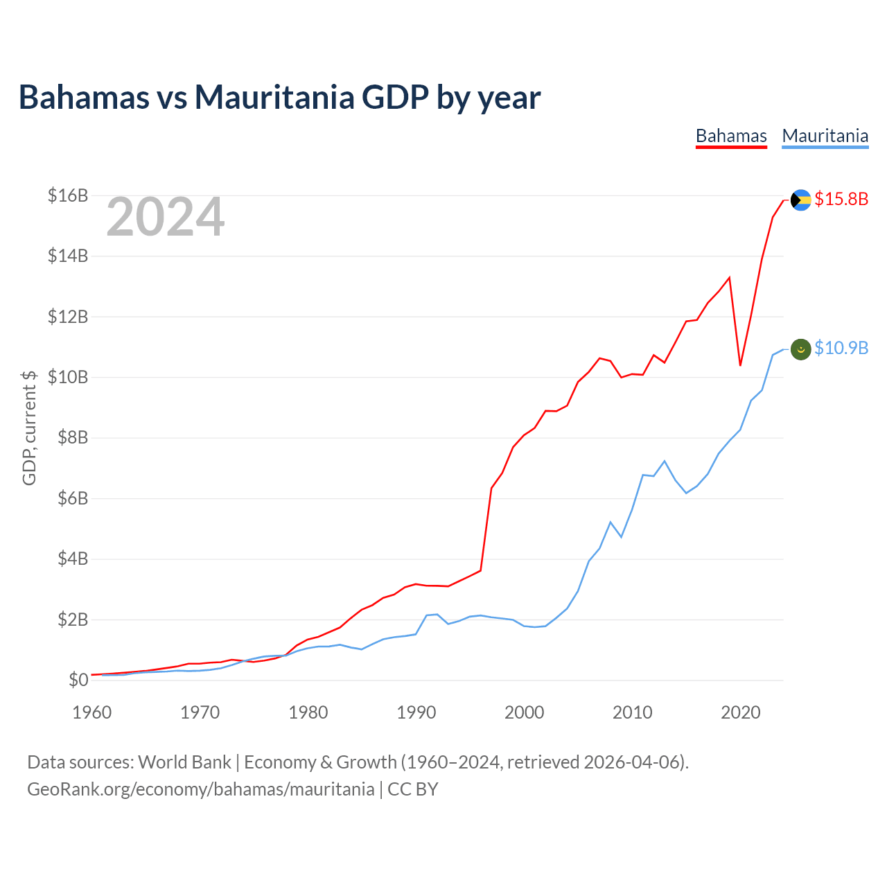 The Bahamas has a GDP of $15.8B compared to $10.9B for Mauritania, ranking 140/197 and 153/197 by economy size, respectively.