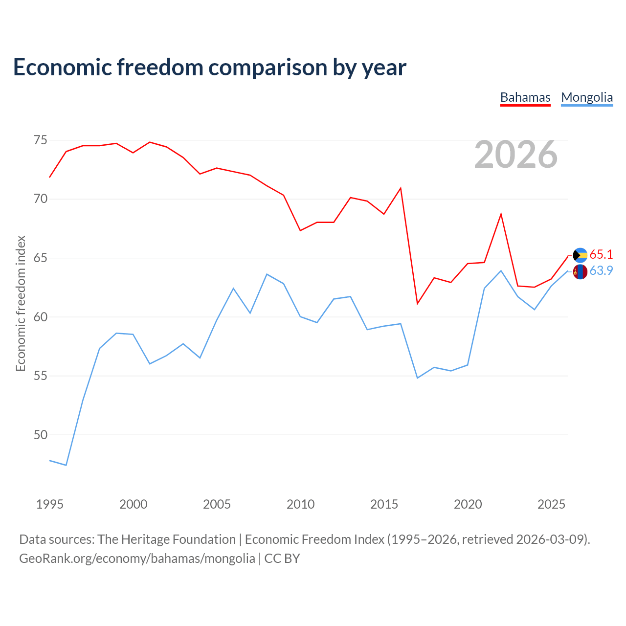 The Economic Freedom Index for the Bahamas is 65.1, ranking 66/197, compared to 63.9 for Mongolia, ranking 76/197. The chart above displays a comparison of annual changes in economic freedom indexes.