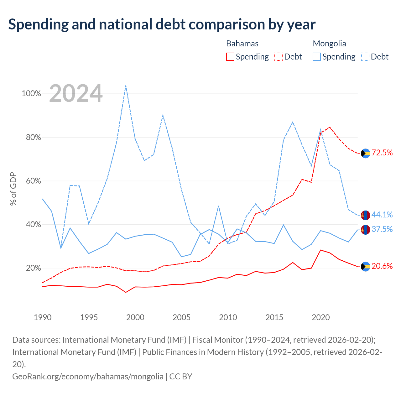 The Bahamas has $11.5B in government debt (72.5% of GDP), compared to $10.5B (44.1% of GDP) in Mongolia.