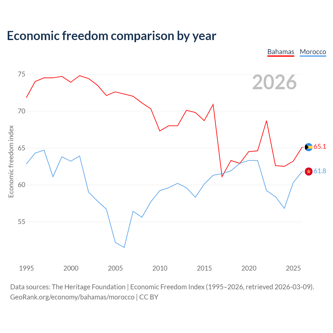 The Economic Freedom Index for the Bahamas is 65.1, ranking 66/197, compared to 61.8 for Morocco, ranking 91/197. The chart above displays a comparison of annual changes in economic freedom indexes.