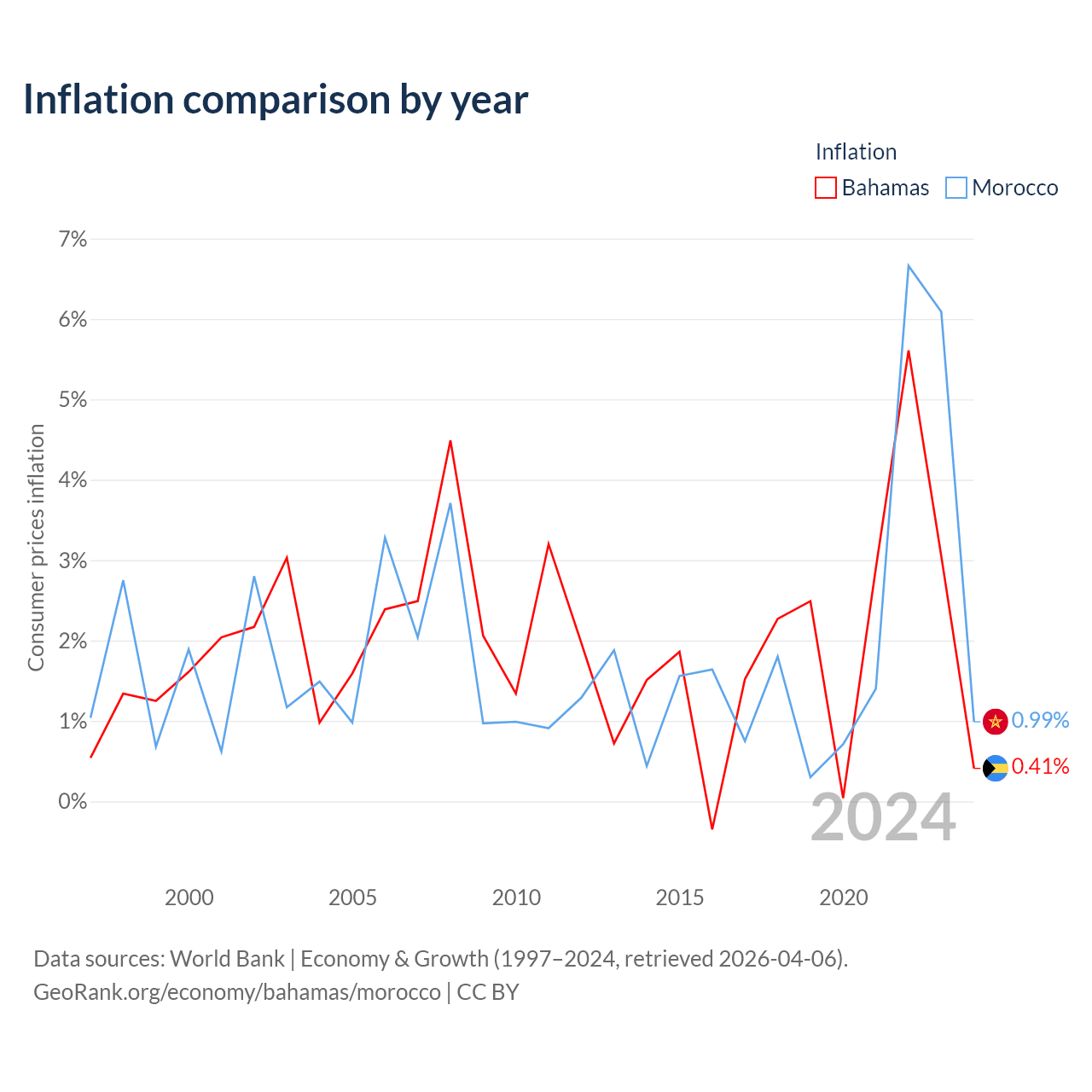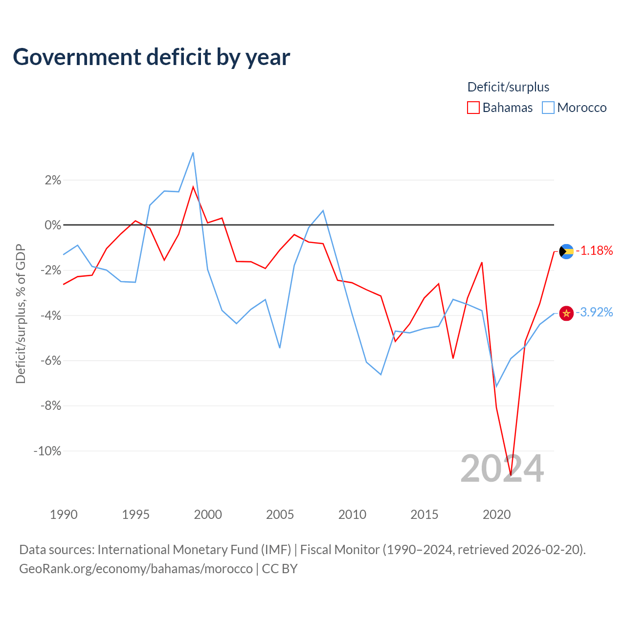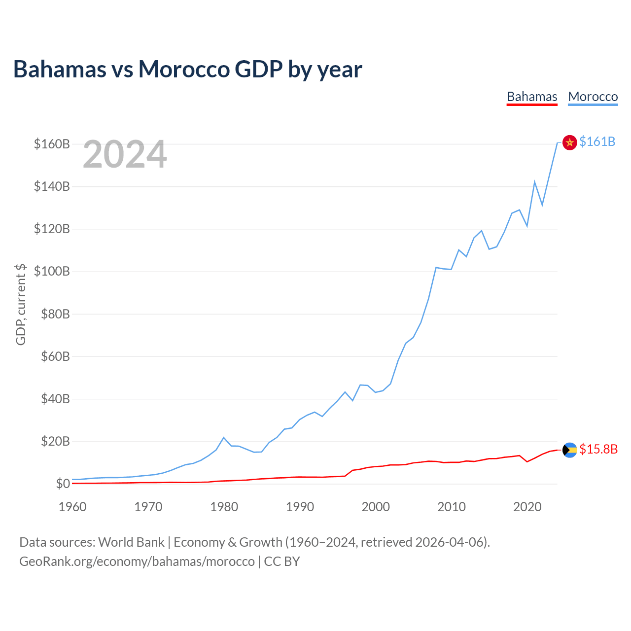 The Bahamas has a GDP of $15.8B compared to $161B for Morocco, ranking 140/197 and 58/197 by economy size, respectively.