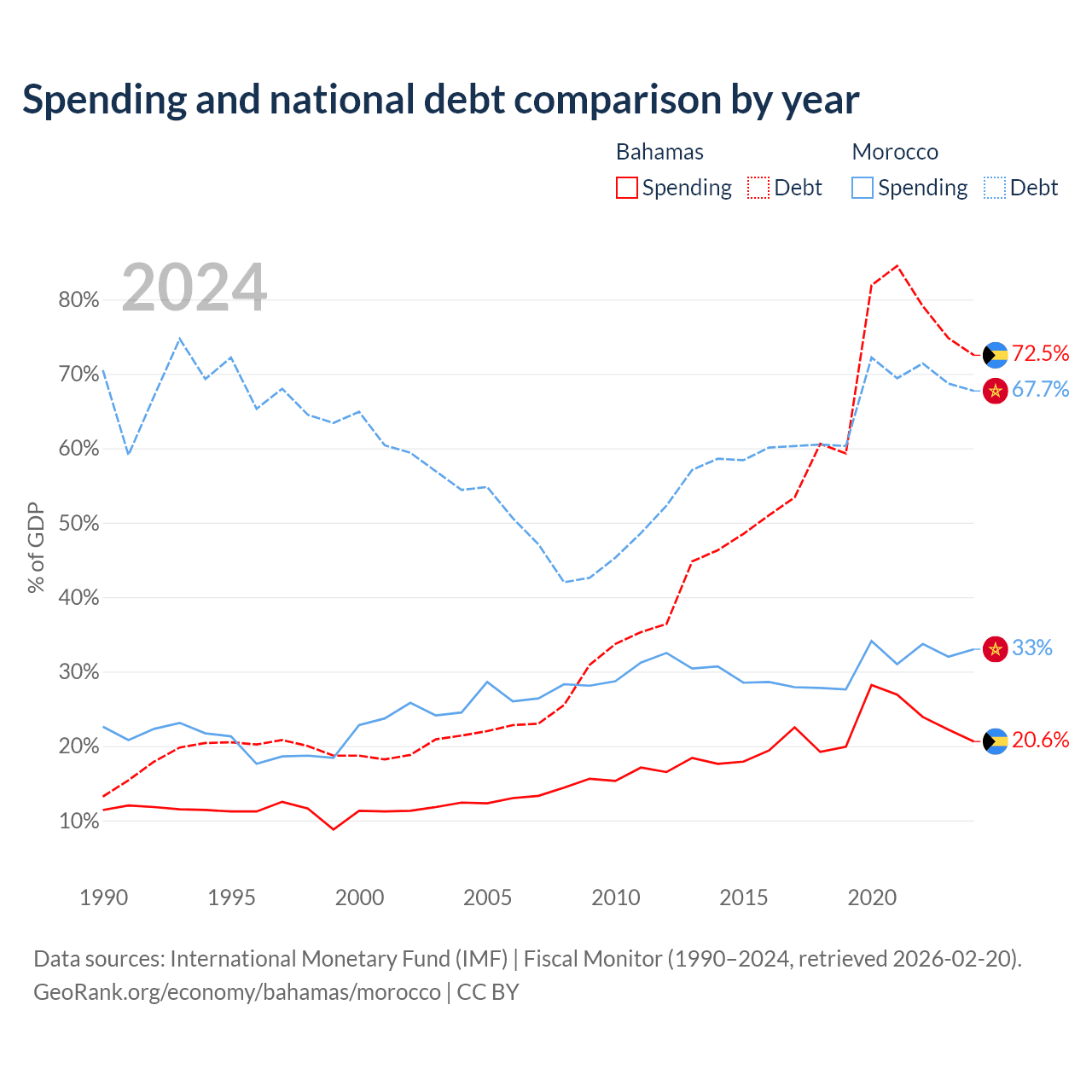 The Bahamas has $11.5B in government debt (72.5% of GDP), compared to $109B (67.7% of GDP) in Morocco.