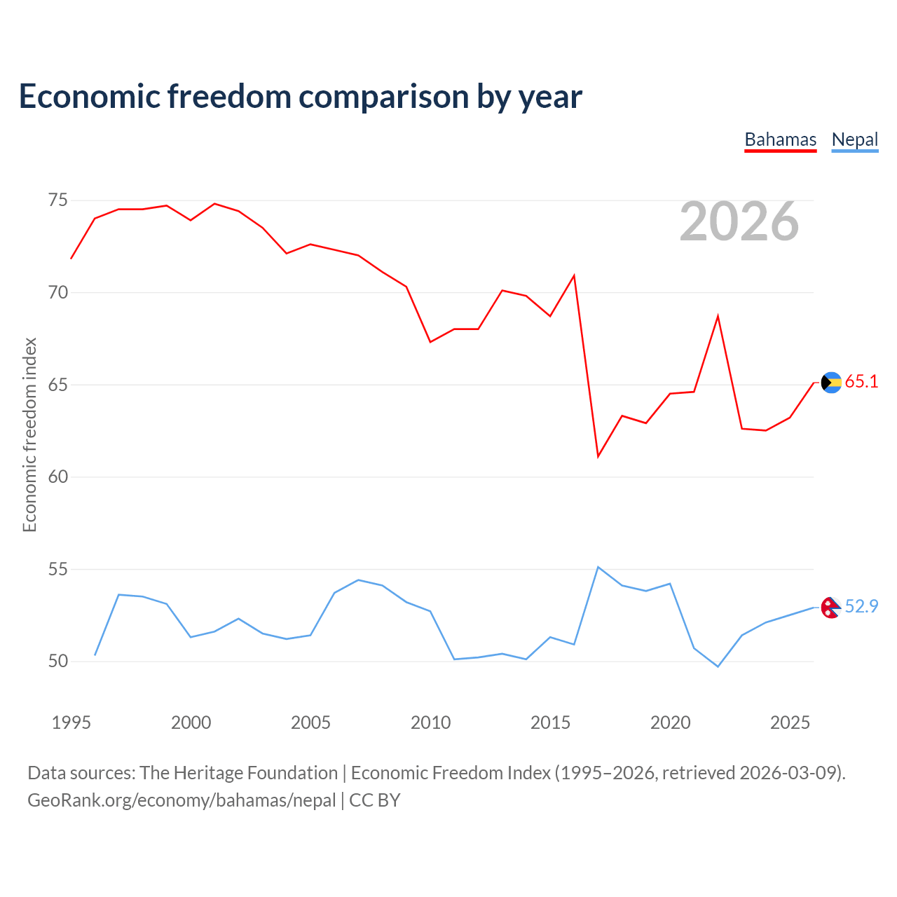 The Economic Freedom Index for the Bahamas is 65.1, ranking 66/197, compared to 52.9 for Nepal, ranking 144/197. The chart above displays a comparison of annual changes in economic freedom indexes.